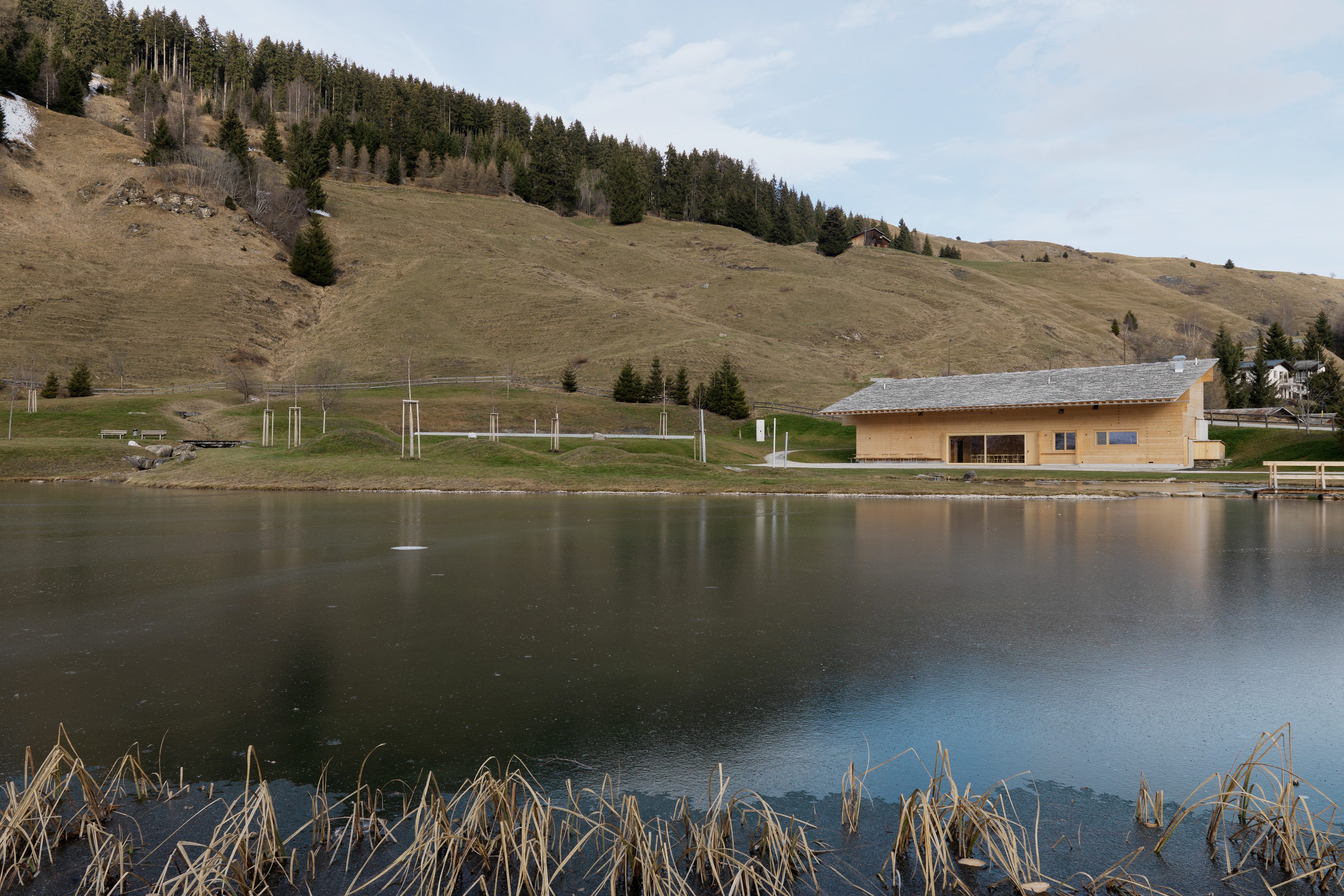 Davos Munts heisst die Landschaft oberhalb des Dorfs Vattiz in der Val Lumnezia im Kanton Graubünden. In diesem ehemaligen Sumpfgebiet realisierte die Gemeinde einen Badesee. Das Badehaus mit Bistro ersetzt eine alte Scheune. Die Architektur von Capaul & Blumenthal folgt traditionellen Werten und setzt auf lokale Materialien. Der massive Strickbau besteht aus heimischer Fichte, das Dach ist mit Steinplatten eingedeckt. Auch innen ist das Holz roh belassen und erinnert an die Stuben auf den Maiensässen. Das Orts- und Geschichtsbewusstsein ergänzen die Architekten mit moderner Technik: Für die Wärme sorgt eine Luftwärmepumpe.