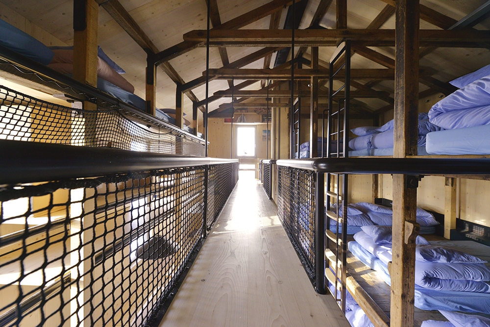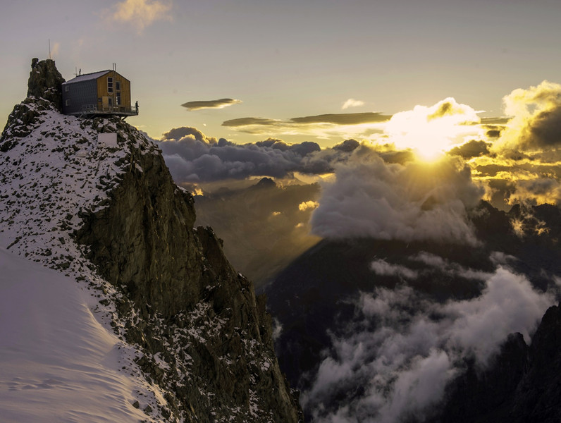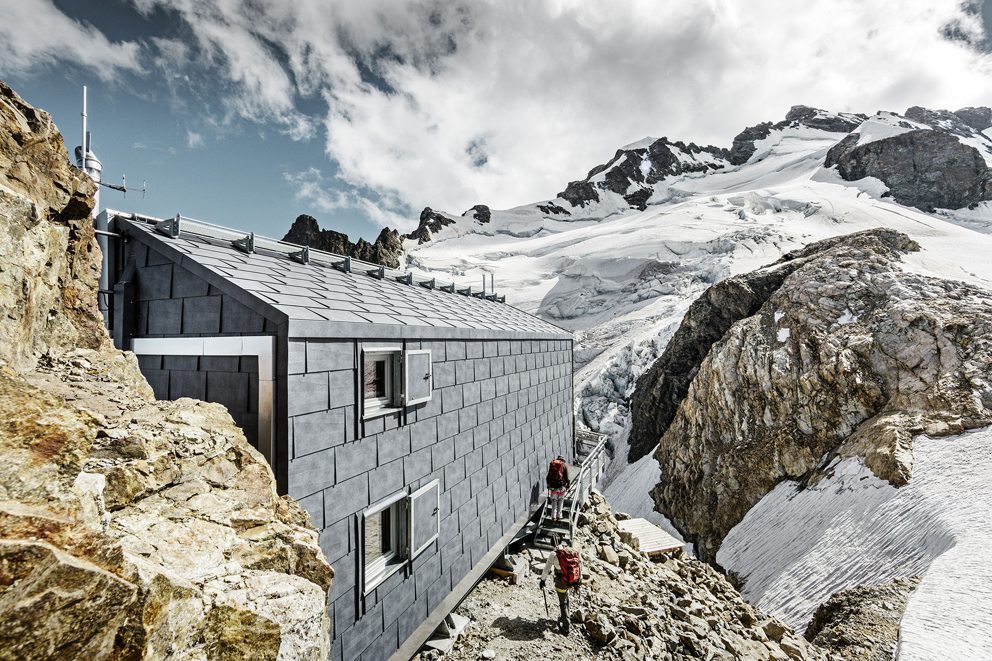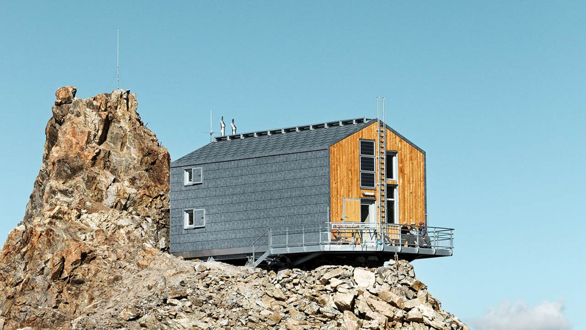 «Das Bergmassiv La Meije liegt im Herzen des Nationalparks Ecrins in den französischen Alpen, sechs Stunden zu Fuss über der Zivilisation. Die Berghütte ist eine der höchsten Europas und thront auf 3440 m ü.M. atemberaubend über dem felsigen Abgrund. Sie ersetzt einen maroden Altbau von 1910. Doch ganz vergessen ist die Vergangenheit nicht. Nachdem sich die Bevölkerung gegen den Abbruch gewehrt hatte, entschied der Bauherr, der französische Alpenclub, das Holz der alten Hütte weiter zu verwenden und eine neue Hülle darum herum zu bauen. Auf kleinstem Raum schaff das Haus Platz für 30 Alpinisten, die sich in Stockbetten vom anstrengenden Aufstieg erholen. Auch die Konstruktion ist am Limit. Das Gebäude trotzt dem garstigen Wind, der mit 250 Stundenkilometern um die Fassaden pfeift, und dem Schnee, der tonnenschwer auf das Dach drückt. Mikropfähle verankern das Haus im Felsen. Die Konstruktion besteht aus massiven Holzplatten, die Boden, Wände und Dach ausbilden. Sie wurden im Tal zusammengebaut und mit dem Hubschrauber hochgeflogen. Holzwolle isoliert das Gebäude gegen die Minustemperaturen, das Dach ist mit Aluminiumplatten verkleidet. Holz und Stahl prägen die einfachen Innenräume. Das Gebäude funktioniert autark, abgesehen vom Gas für die Küche. Solarkollektoren und PV­Module versorgen es mit Energie. Und sollte der Bau einmal nicht mehr gebraucht werden, kann er problemlos demontiert und die Bergspitze wieder der Natur überlassen werden. »