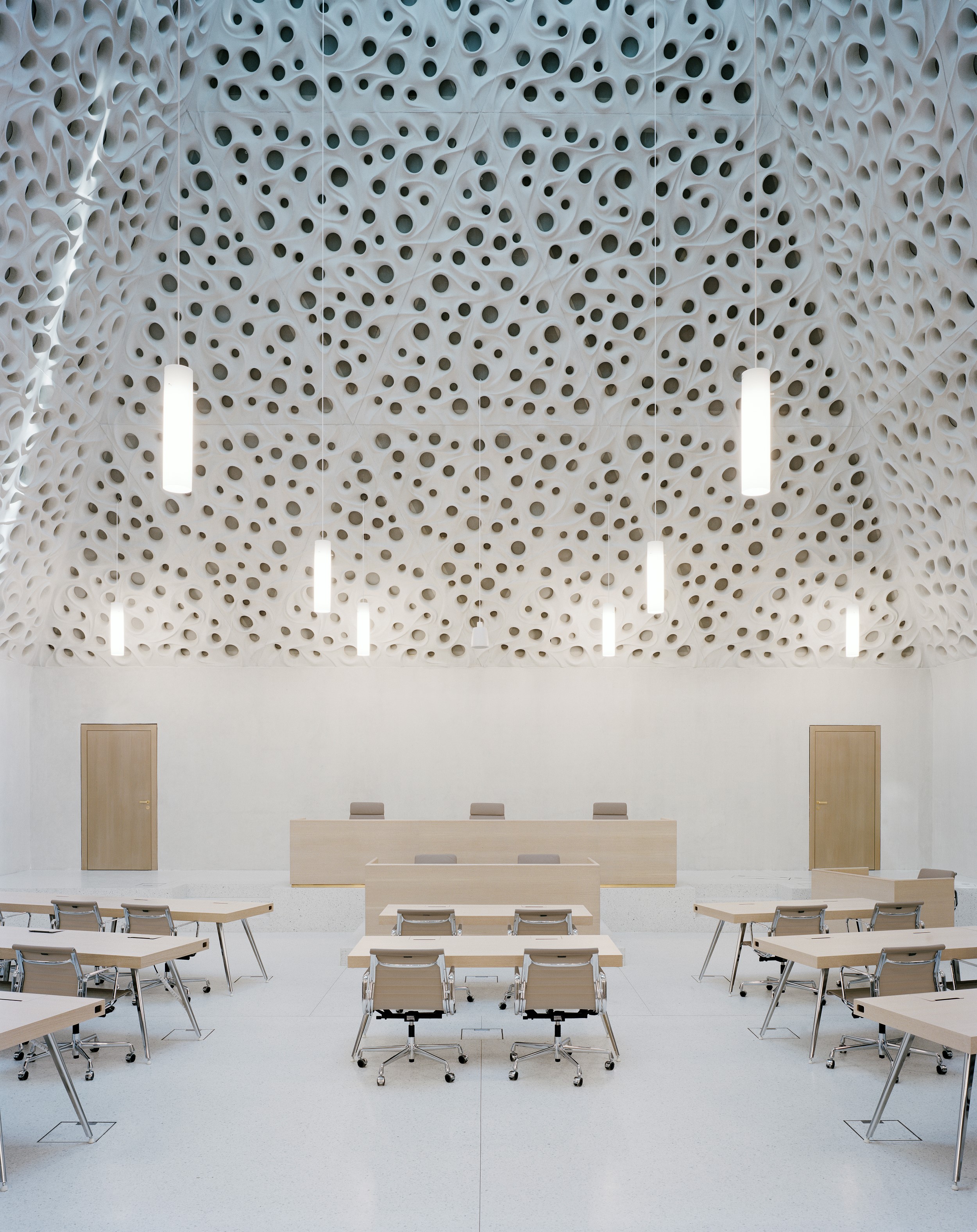 «Das Gebäude verankert eine öffentliche Funktion in den Bergen. Der Neubau des Schweizer Bundesstrafgerichts von Bellinzona im Tessin erweitert den neoklassizistischen Kopfbau, der als Haupteingang erhalten bleibt. Die Betonmauern, die in weisser Unschuld strahlen, führen die alte Fassade in zeitgenössischer Abstraktion weiter. Die Architekten organisieren die Erweiterung diszipliniert um den Gerichtssaal. Zwei Lichthöfe schaffen Durchblicke und Orientierung im dichten Raumgefüge. Der Gerichtssaal ist der architektonische Höhepunkt, der wie ein Gegenpol zur glatten Fassade wirkt. Wie im kleinen Gerichtssaal überwölbt eine pyramidenförmige Kuppel den Raum. Sie fängt das Licht von oben ein. Ornamente verzieren die schräg zulaufenden Wände und verbessern die Akustik. Die Formenvielfalt stammt aus computergesteuerter Fertigung.