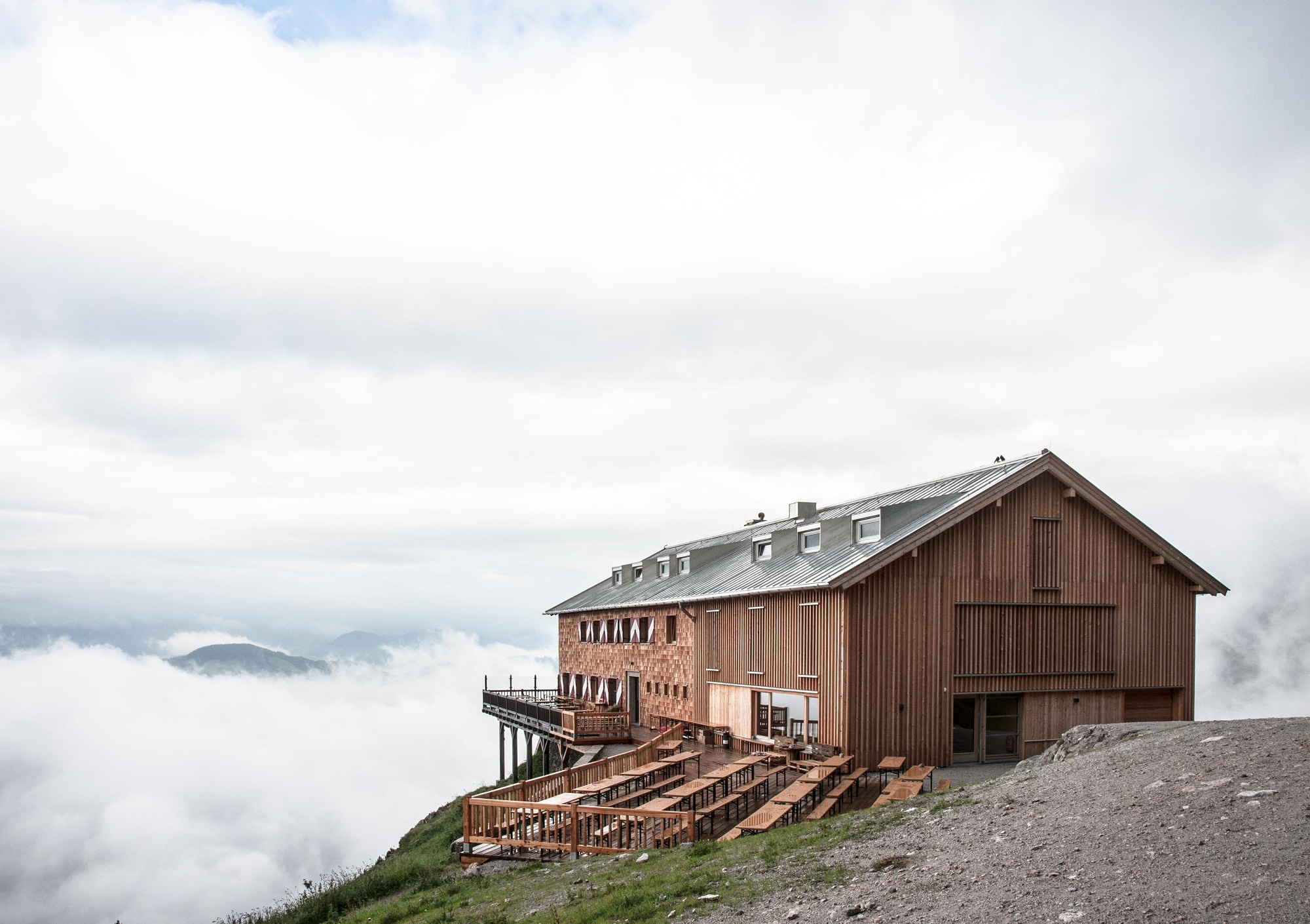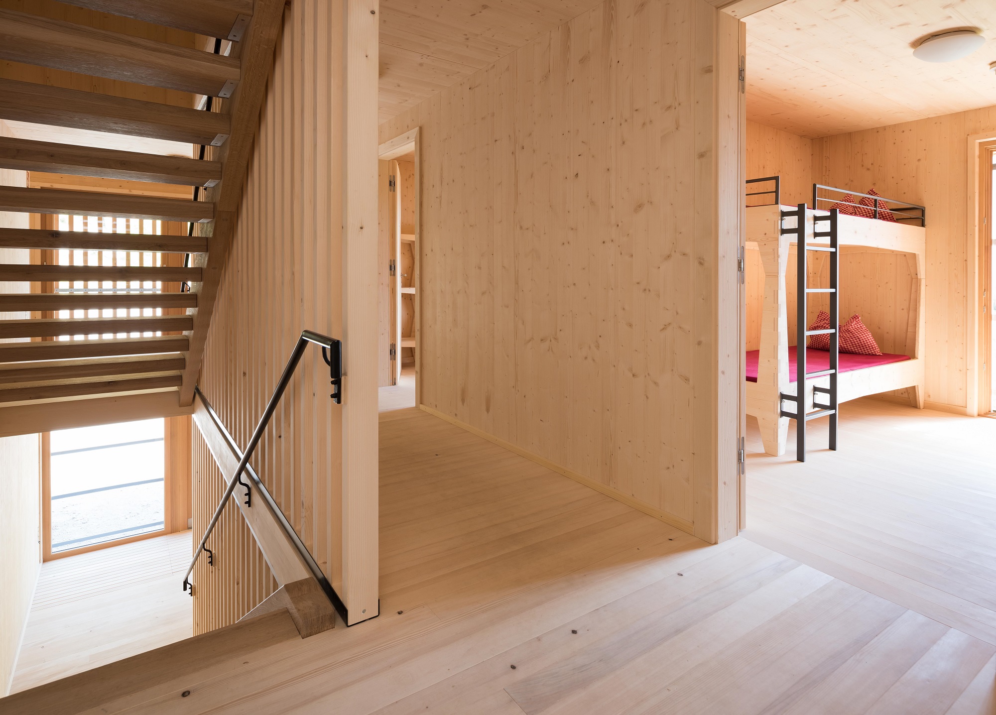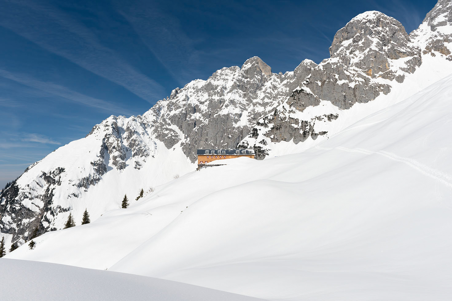 Diese Hüttenerweiterung wird hoffentlich oft übersehen. Dann hätte sie ihr Ziel erreicht, unauffällig und selbstverständlich zu sein. Der kompakte Anbau ersetzt zwei andere Hütten, die in einem Lawinengebiet standen. Er führt alle vorgegebenen Strukturen der 100 Jahre alten Urhütte weiter und zeigt dennoch, dass er ein Ergebnis unserer Zeit ist. Das Gebäude ist fast ausschließlich aus (Massiv-) Holz gefertigt. Die Fassade ist wie im Bestand holzverkleidet, aber so dass alt und neu erkennbar bleiben. Die kleinen Fenster des Bestandes sind im Prinzip weitergeführt, nun allerdings als raumhohe Verglasungen für helle Zimmer. Die Betten und die Einrichtung des neuen Seminarraums wurden aus massiver Lärche entworfen und (wie alle anderen Bauteile auch) von einem lokalen Betrieb gefertigt. Durch Verzicht auf Komfort konnte das Gebäude einfach und fast technikfrei ausgeführt werden. So sollen für weitere 100 Jahre andere an diesem wunderbaren Ort Vortritt haben: die Berge des Kaisergebirges.