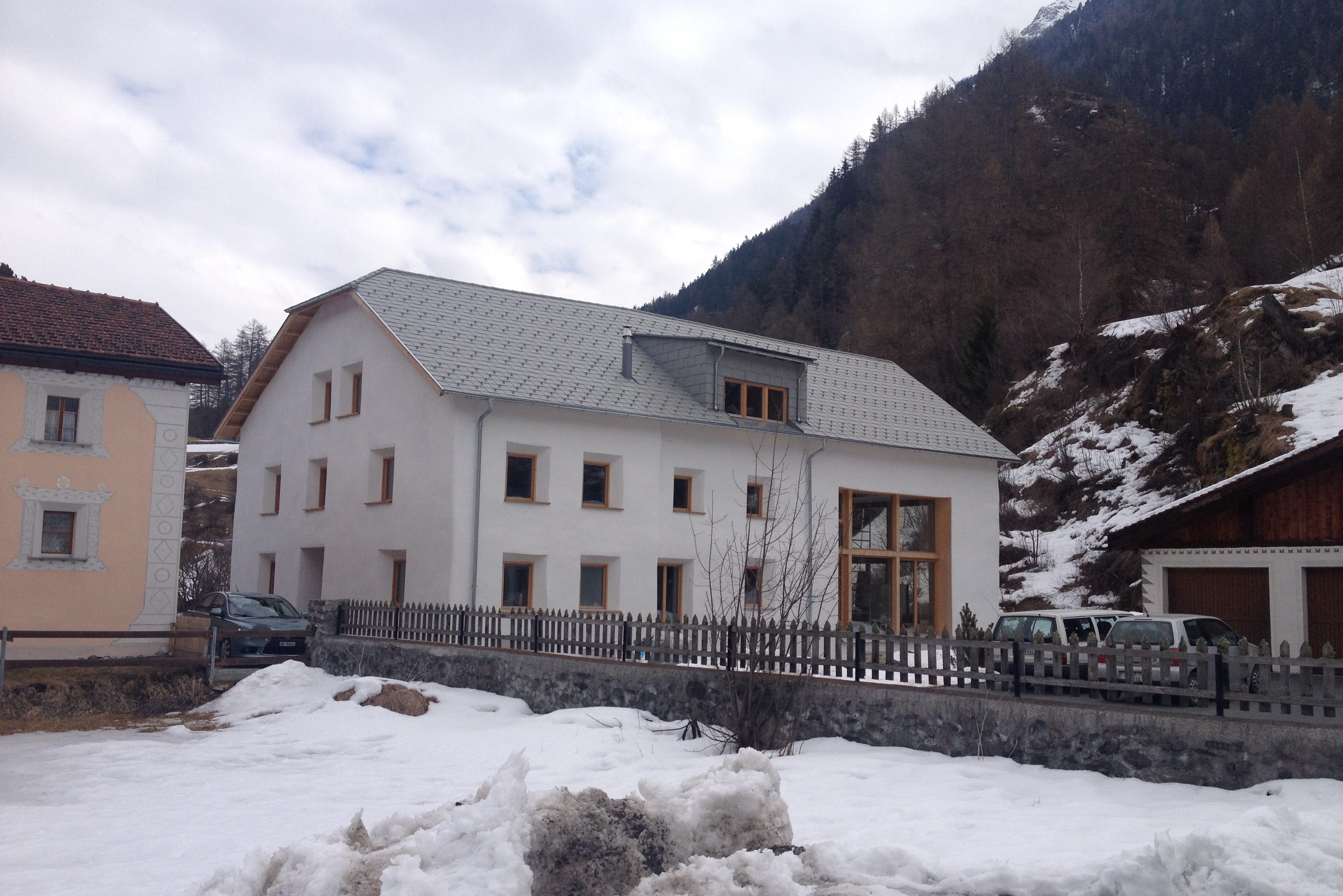 Das über 200-jährige Bauernhaus in Susch im Engadin wurde energetisch saniert. Der Architekt Werner Schmidt erweiterte die Holzheizung mit einem Kombikessel, der Pellets und Stückholz verbrennt. Die Fenster sind nun dreifach verglast. Bis zu 80 Zentimeter dicke Strohballen isolieren die Fassade und das Dach. Das entspricht rund 80 Tonnen Stroh oder 110 Tonnen CO2, die im Gebäude eingelagert werden. Diese Dämmung führt zu einer wuchtig scheinenden Mauer mit tiefen Fensterfurchen, wie sie für Engadinerhäuser typisch sind. Bautradition, Bauökologie und Energieziele finden hier zusammen. Zudem verbessert die Hülle aus Stroh das Raumklima und schirmt den Strassenlärm ab.