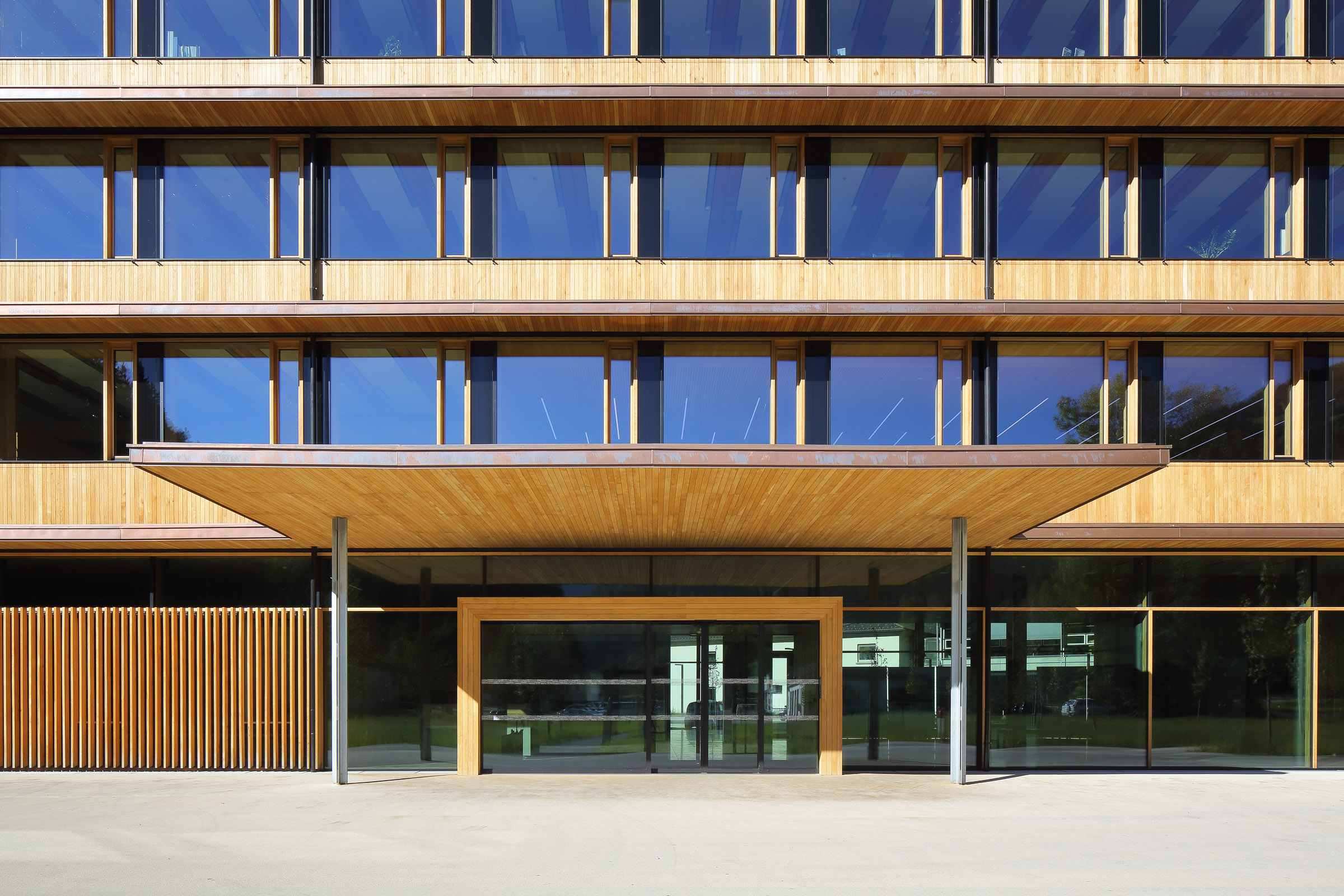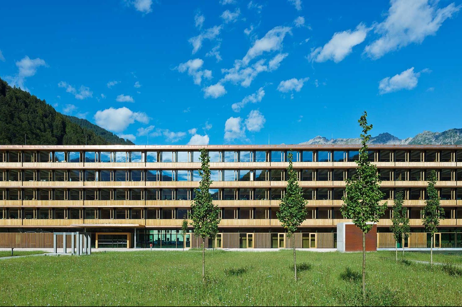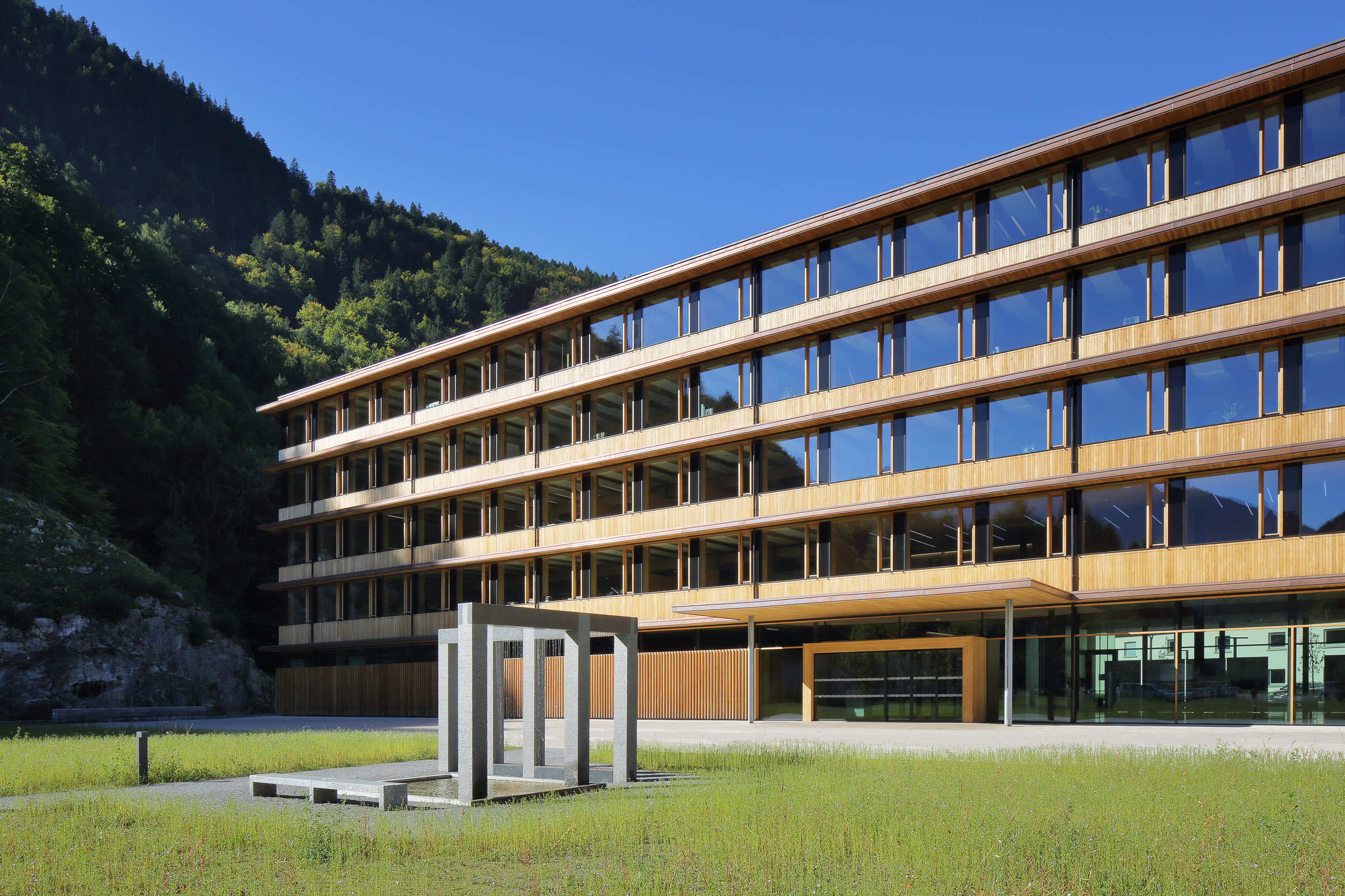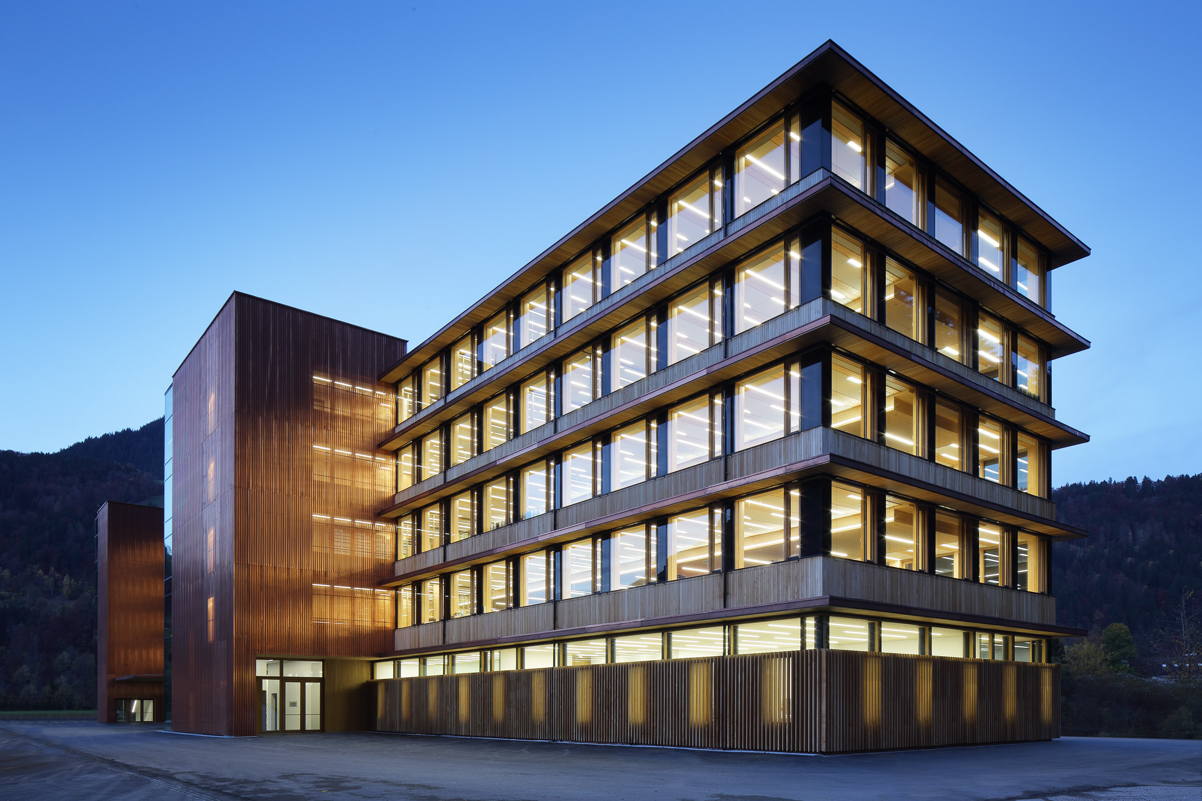 «Am Ufer eines Kraftwerk­Ausgleichsbeckens in Vandans streckt sich das Bürogebäude der Vorarlberger Illwerke 120 Meter in die Länge. Das vordere Drittel ragt sogar über das Wasser. Mit 10 000 Quadratmeter Nutzfläche ist hier eines der grössten Bürogebäude aus Holz in Mitteleuropa entstanden. Es ergänzt einen bestehenden Bau, der quer zum Ufer steht. Vor dem Eingang erstreckt sich ein kleiner Park, der die 270 Beschäftigten empfängt. Die Konstruktion basiert auf dem System des Lifecycle Towers, mit dem Hermann Kaufmann in Dornbirn einen 27 Meter hohen Turm realisiert hat. Das Untergeschoss, die Decke über dem Erdgeschoss und die Treppenkerne sind betoniert. Sonst trägt Holz in Kombination mit Stahl und Beton. Die vorgefertigten Rippendecken sind als Holz­Beton­Verbund konstruiert, an der Fassade tragen Doppelstützen aus Holz. Dank des ausgeklügelten Brandschutzes muss das Holz nicht verkleidet werden. So prägt es die behagliche Atmosphäre in den Büros wesentlich mit. Auf jedem Geschoss schützt ein umlaufendes Vordach die verglaste Fassade vor der Sonne und ermöglicht einen einfachen Unterhalt. Gekühlt und geheizt wird das Passivhaus mit Wasser aus dem Ausgleichssee, das im Winter mit einer Wärmepumpe erhitzt wird. Das Projekt zeigt im grossen Stil, wie eine Firma energiesparsam vorangeht. Und damit nicht nur die Umwelt schont, sondern auch Arbeitsplätze im Tal erhält.»