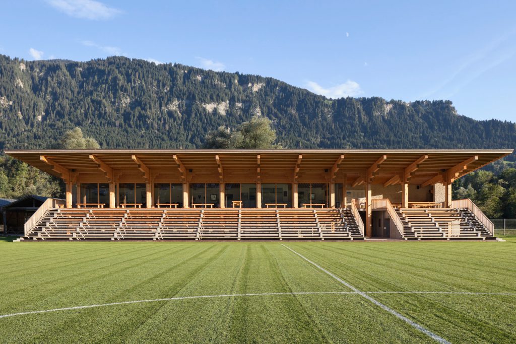 La tribuna è situata sul Reno, sotto il villaggio di Schluein, nell’Oberland grigionese. Qui giocano a calcio diverse squadre della Uniun Sportiva USSI dei paesi di Schluein e Ilanz. Gli usi e i costumi della regione prevedono che siano i membri dell’associazione sportiva a provvedere all’ampliamento e alla manutenzione del proprio campo di calcio. Ma la USSI è andata perfino oltre. Perché nella prima squadra gioca Jan Berni, goleador e architetto, progettista della generosa tribuna. La spina dorsale della struttura è costituita da un muro chiuso su cui appoggia la tribuna in legno da 500 posti, sormontata da un maestoso tetto. Al piano terra sono sistemati gli spogliatoi, attorno ad una fontana. Il piano superiore ospita un ristorante. Gli architetti Jan Berni e Georg Krähenbühl hanno anche diretto i lavori e organizzato le 6000 ore di volontariato, in modo da consentire ai membri del club di svolgerli direttamente: dal concepimento del lavoro di carpenteria con l’uso di legno lamellare incollato anziché inchiodato, fino alle finiture interne con i materiali messi a disposizione. E’ nato così un insieme robusto, dall’estetica convincente e talmente funzionale che anche grandi squadre, fra cui l’SV Amburgo, passano qui alcune settimane per allenanarsi.