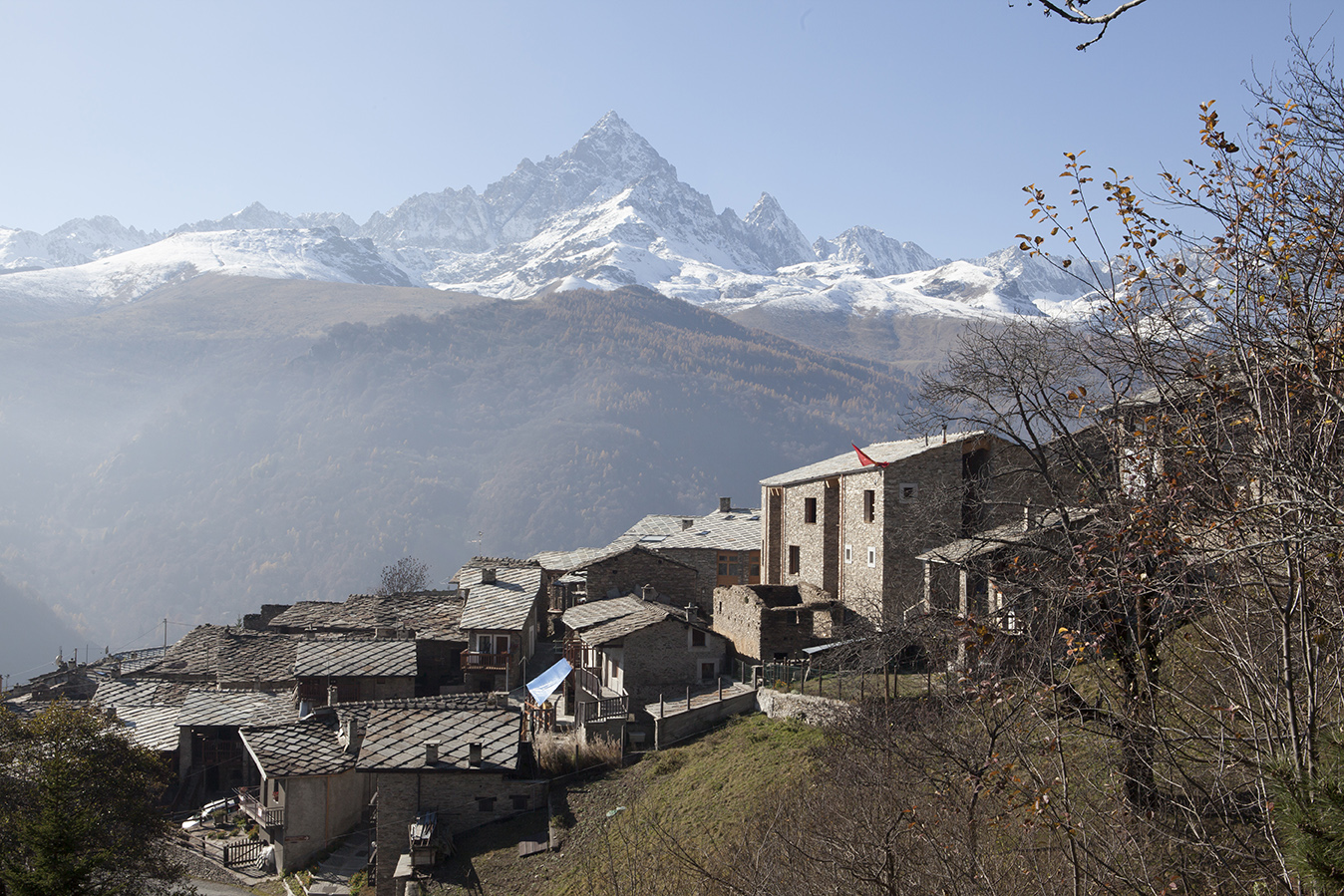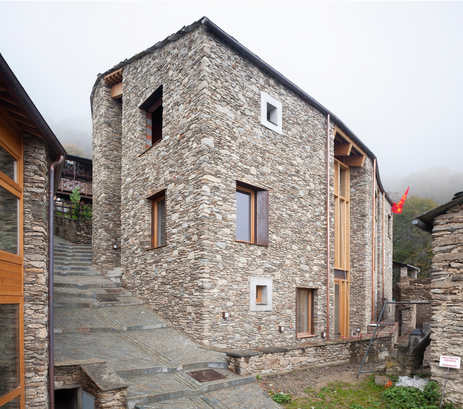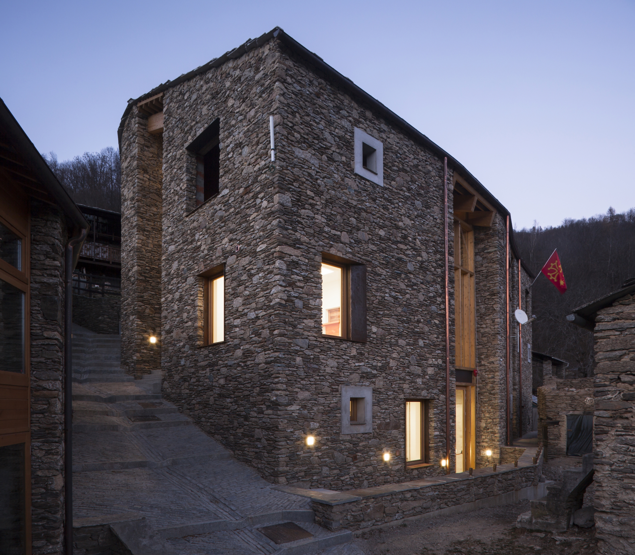 Ostana è un comune di montagna poco lontano dalle sorgenti del Po, con vista sul Monviso. Cent’anni fa qui vivevano 1200 persone, vent’anni fa ne erano rimaste sei. Gli architetti Massimo Crotti, Antonio De Rossi e Marie-Pierre Forsans hanno trasformato una rovina in una Casa della Cultura. Ciò è stato possibile grazie ai finanziamenti della Regione Piemonte, dell’Italia e della UE. Nella casa in pietra sono nati diversi ambienti, tenuti insieme da una struttura in cemento armato interna. Una finestra divide la facciata in verticale e ricorda che ad Ostana in passato il vicolo attraversava le case – il ‹pourtoun›. L’impegno sociale e lo sviluppo regionale attecchiscono – oggi sono nuovamente in 40 ad abitare ad Ostana.