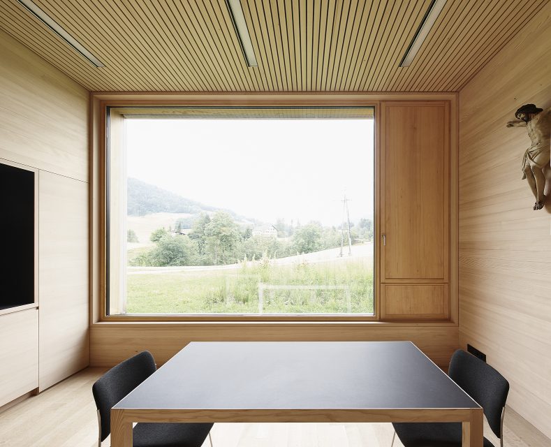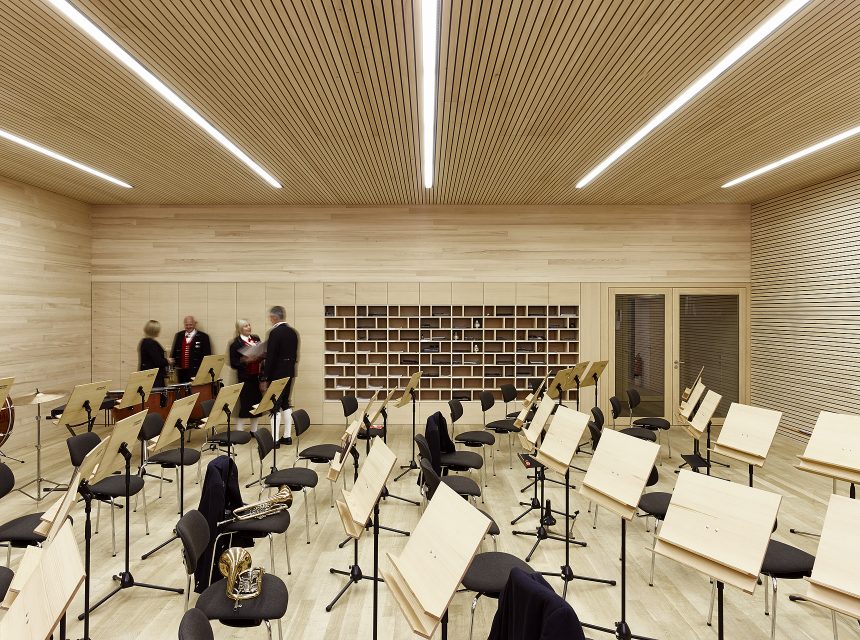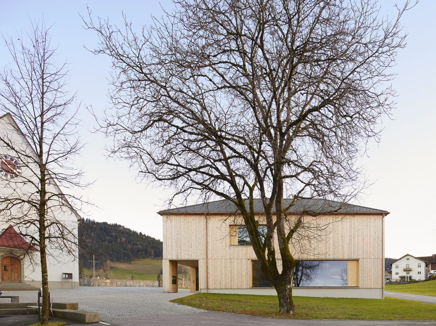 « Già da anni la comunità di Krumbach nel vor-arlberg ha iniziato, in modo esemplare, a dare nuova vita al centro del paese. Una nuova pietra miliare è stata posta con la nuova casa parroc-chiale. Nella sala comunale e nella biblioteca si incontra l’intero villaggio. Grazie all’uso condivi-so fra comune e parrocchia, l’edificio è sia cen-tro culturale che parrocchiale e in tal modo si è creato un nuovo punto di incontro per il paese.L’edificio in puro legno mostra legno non trattato da qualsiasi parte si voglia guardarlo. Il pavimento è di parquet grezzo, le pareti sono rivestite di tavole orizzontali, il soffitto è rico-perto di listelli. Gli architetti hanno progettato gli scaffali per la biblioteca, mentre i tavoli sono stati piallati da un falegname di Krumbach. L’edi-ficio punta sull’artigianato locale e utilizza solo legno di proprietà del comune. »