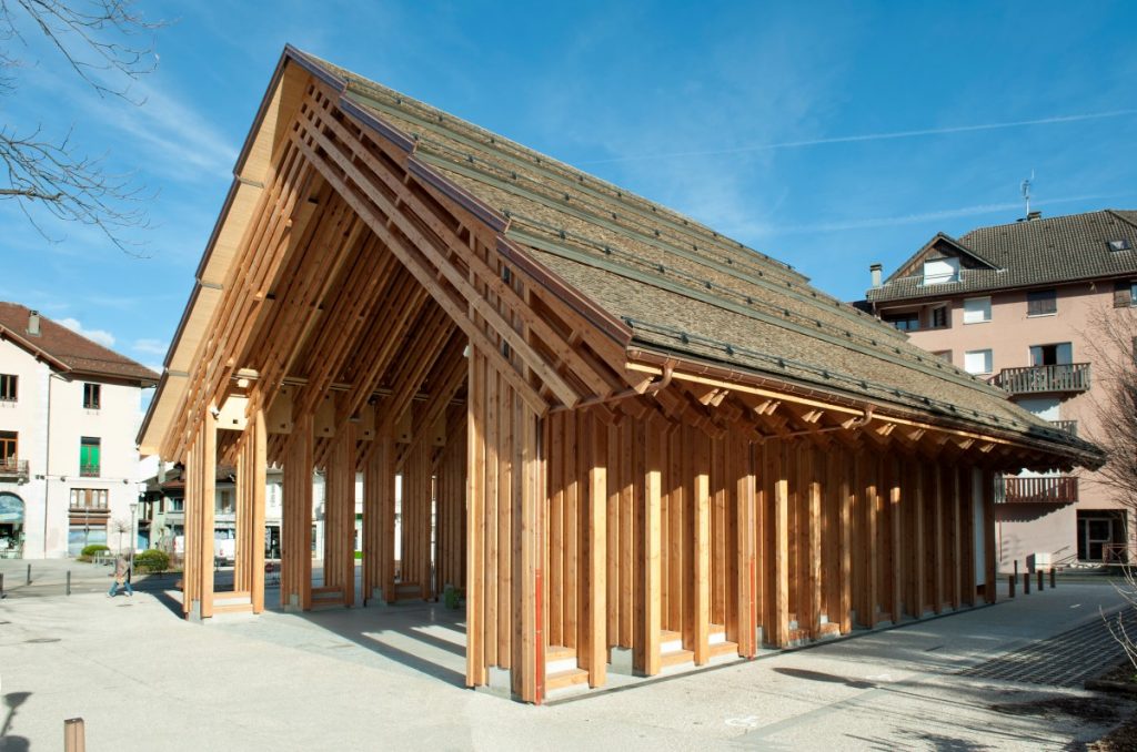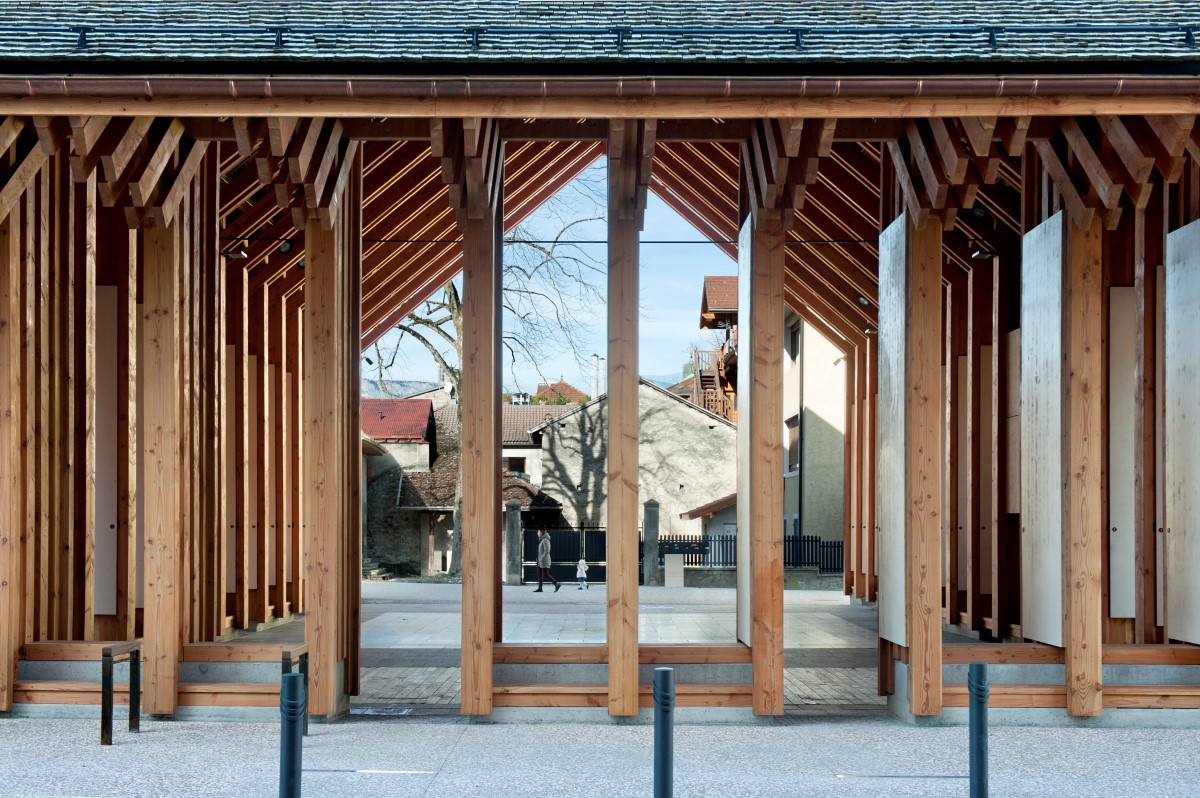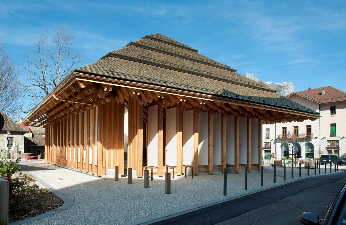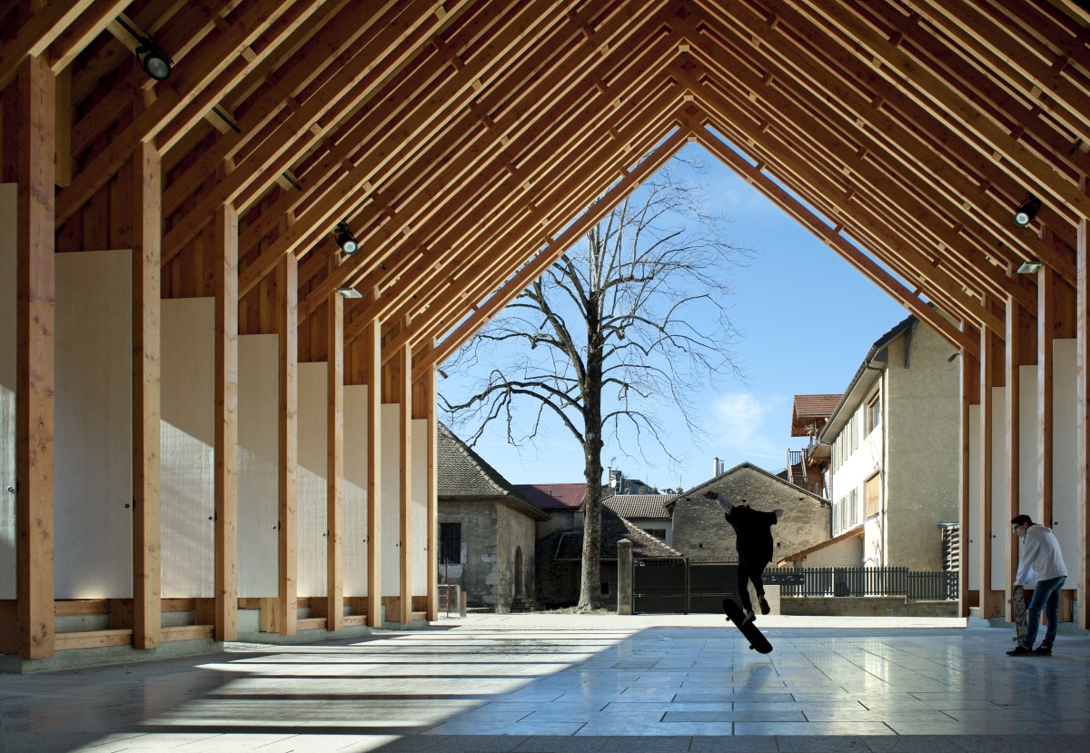 Ridefinendo il cuore pulsante del comune con la sua posizione centrale, il centro culturale ed economico di Faverges offre, sotto il suo largo tetto, un luogo di vita pubblico ed accessibile a tutti. Può trasformarsi in una sala per spettacoli con il suo palcoscenico pieghevole e i grandi pannelli in legno sui tre lati. Il suo linguaggio architettonico è forte e calmo, si impone senza opprimere, presente, ma con semplicità. Il bosco di pali, in abete douglas, si trasforma in travi tra cui filtra la luce. Le foglie del bosco diventano le tegole in legno di castagno spaccato, una tecnica tradizionale locale che vogliamo conservare per la sua eleganza e la scarsa energia grigia necessaria. La molteplicità degli usi proposti, la scelta di materiali massicci, locali e naturalmente sostenibili, il disegno architettonico che garantisce la perennità dei materiali, i dispositivi low-tech, come le persiane in legno, ne fanno un progetto decisamente sostenibile.
