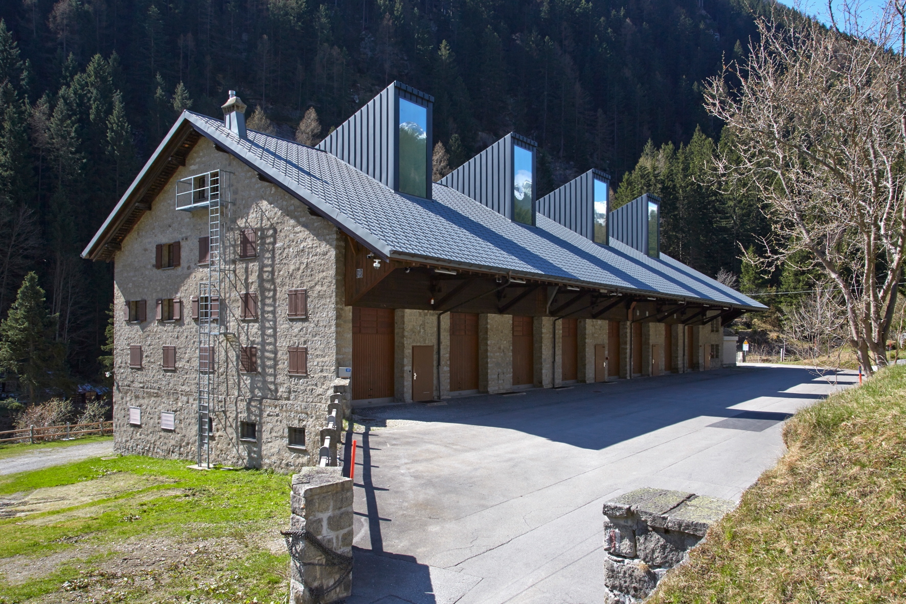 L’arsenale ‹Stücki› a Göschenen è stato costruito nel 1943 in pesante pietra naturale, con un tetto dalle ampie sporgenze. Il collezionista d’arte Christoph Hürlimann ha trasformato l’edificio in un deposito di oggetti d’arte accessibile al pubblico. Sotto il tetto gli architetti Burkhalter e Sumi hanno allestito quattro atelier utilizzati in estate. A tal fine hanno rialzato i vecchi abbaini, trasformandoli in veri e propri cannoni luminosi. Per il resto, gran parte degli esterni è rimasta invariata. Internamente una mano di colore bianco collega le diverse parti. Con pochi interventi gli architetti conservano un testimone d’epoca, riconducendolo verso un nuovo futuro.