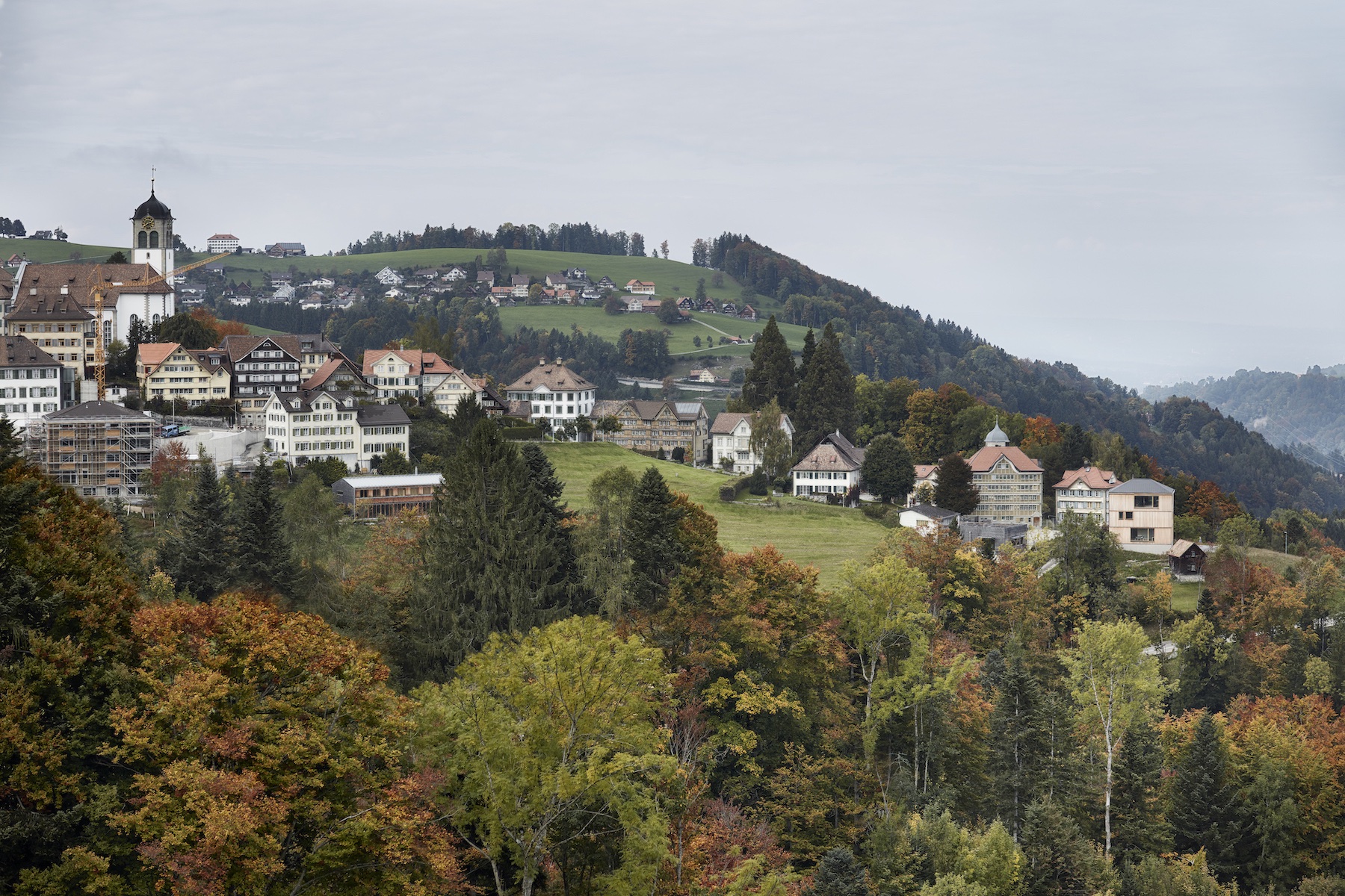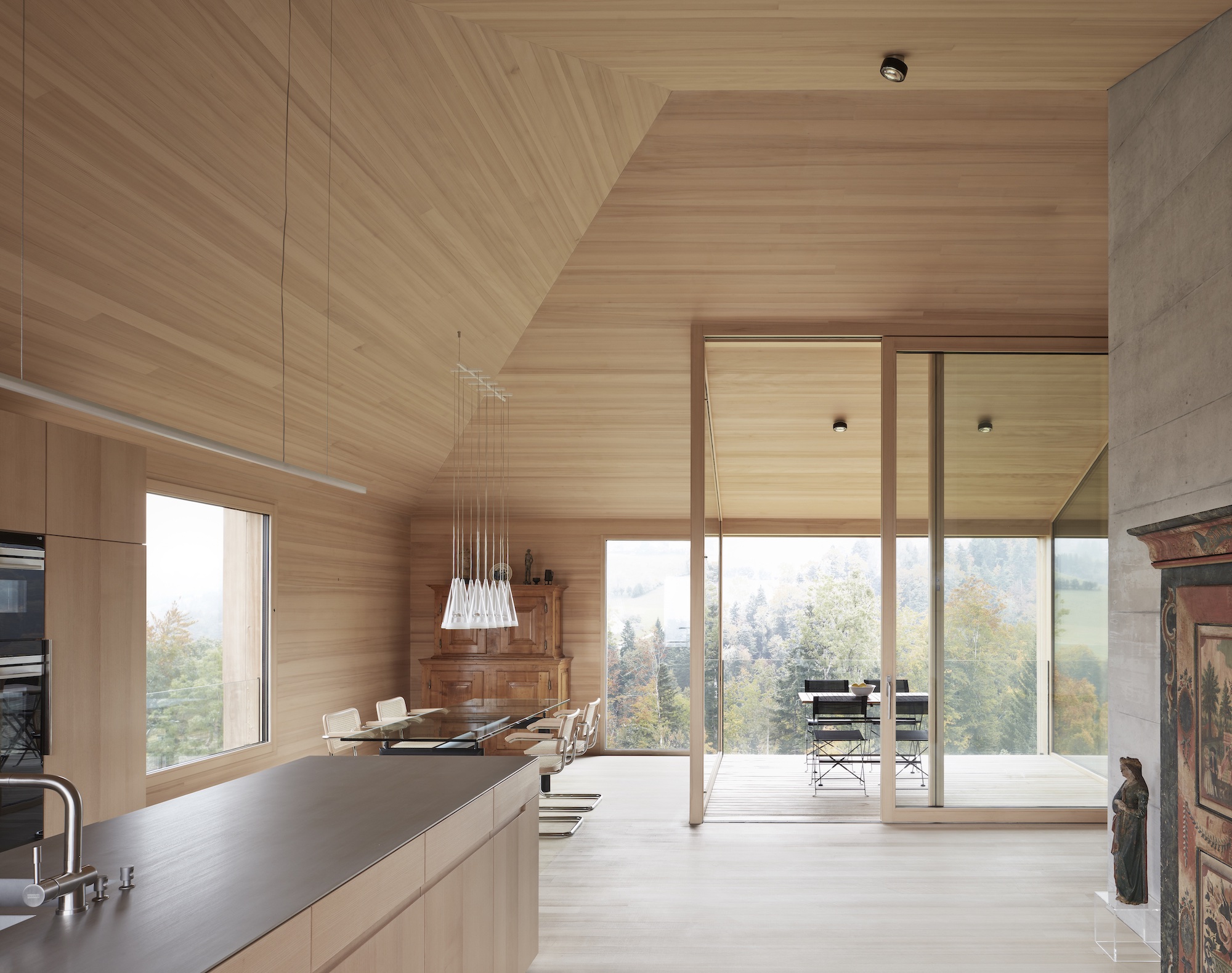 La suggestiva posizione panoramica del villaggio di Trogen, situato su una dorsale nel frastagliato paesaggio collinare dell’Appenzell, ha sempre richiesto una forma di insediamento compatta. A partire dal XVII secolo il villaggio raggiunse la prosperità grazie alla dinastia commerciale degli Zellweger. I vicoli stretti e il centro storico compatto del villaggio fanno quasi dimenticare di essere in Svizzera. In queste condizioni una casa nuova in un piccolo villaggio viene subito notata – soprattutto quando sostituisce una casa contadina bruciata in un’area classificata come “insediamento da proteggere di importanza nazionale”. La Haus am Schopfacker nasce dalla tradizione di un ordinamento storico che caratterizza molte città dell’Appenzell. Il suo linguaggio architettonico fa chiaro riferimento alle forme residenziali tradizionali dell’alta borghesia. Il nuovo edificio con la dependance al piano terra assume le proporzioni dell’ambiente costruito circostante. Si posiziona come edificio indipendente dove un tempo sorgeva la vecchia casa contadina e continua a segnare una sorta di “chiave di volta” al margine orientale del villaggio. Il dialogo tra antico e moderno culmina all’interno dell’edificio.