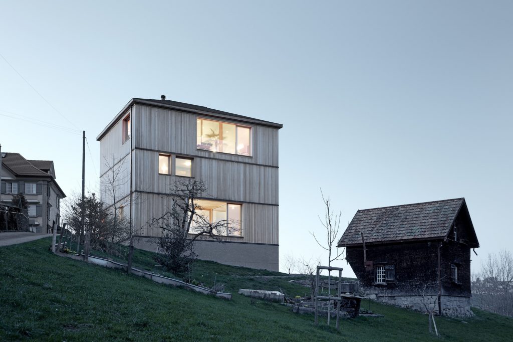 La suggestiva posizione panoramica del villaggio di Trogen, situato su una dorsale nel frastagliato paesaggio collinare dell’Appenzell, ha sempre richiesto una forma di insediamento compatta. A partire dal XVII secolo il villaggio raggiunse la prosperità grazie alla dinastia commerciale degli Zellweger. I vicoli stretti e il centro storico compatto del villaggio fanno quasi dimenticare di essere in Svizzera. In queste condizioni una casa nuova in un piccolo villaggio viene subito notata – soprattutto quando sostituisce una casa contadina bruciata in un’area classificata come “insediamento da proteggere di importanza nazionale”. La Haus am Schopfacker nasce dalla tradizione di un ordinamento storico che caratterizza molte città dell’Appenzell. Il suo linguaggio architettonico fa chiaro riferimento alle forme residenziali tradizionali dell’alta borghesia. Il nuovo edificio con la dependance al piano terra assume le proporzioni dell’ambiente costruito circostante. Si posiziona come edificio indipendente dove un tempo sorgeva la vecchia casa contadina e continua a segnare una sorta di “chiave di volta” al margine orientale del villaggio. Il dialogo tra antico e moderno culmina all’interno dell’edificio.