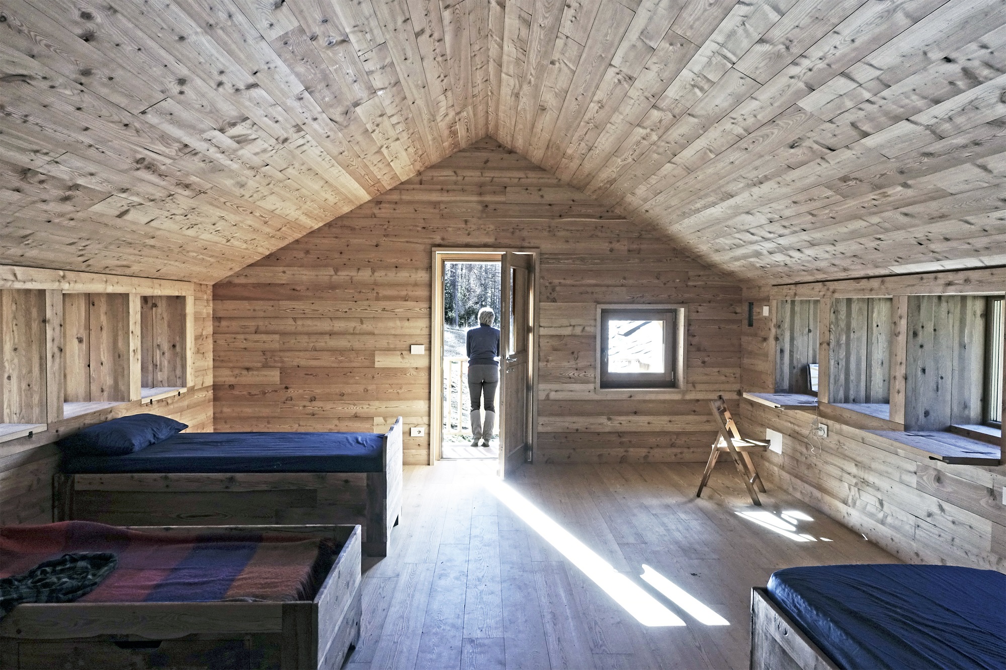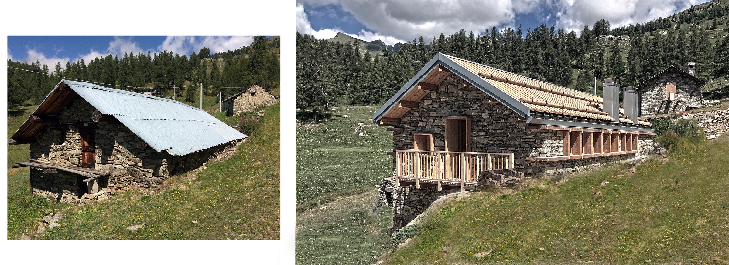 L’ostello culturale inizia con la fine del romanzo “Le otto montagne”. Un libro che ha girato il mondo, partendo da qui: Fontane, frazione del comune di Brusson, in Val d’Ayas. Qui è accaduta la storia, qui è scritto il libro. Se la storia è quella di una ricerca di sé nel ristretto e universale mondo montano, l’edificio racconta quella dei cambiamenti necessari per non morire. L’alpeggio è ricostruito attorno ad una nuova struttura di legno: le sue pietre proteggono l’esterno, il legno si trasforma in letti, tavoli e librerie. Dagli sguardi di porte e finestre emerge la nuova anima di larice, che inquadra il paesaggio. La maggiore altezza è raccontata dalla lunga vetrata sotto-gronda, ritmata dalla scansione degli scrittoi interni. Opposto alla falda di assi di legno, il lato soleggiato espone i pannelli fotovoltaici, elemento visibile di una macchina che non consuma, ma produce energia.