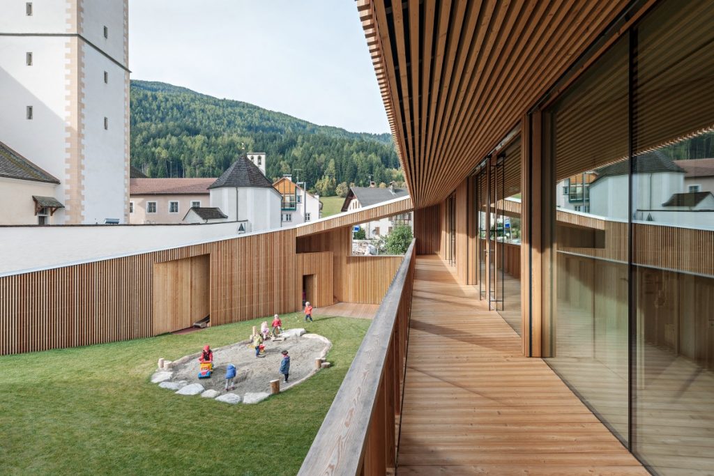All’interno della struttura secolare del villaggio di Niederolang, la scuola dell’infanzia racconta l’interazione tra tradizione, tempo presente e natura. L’edificio in legno è circondato da un muro massiccio e protegge il giardino abbracciandolo in un gesto amichevole. La parete alterna materialità e volumi: accoglie, incornicia, nasconde, invita al gioco e regala spunti e prospettive.