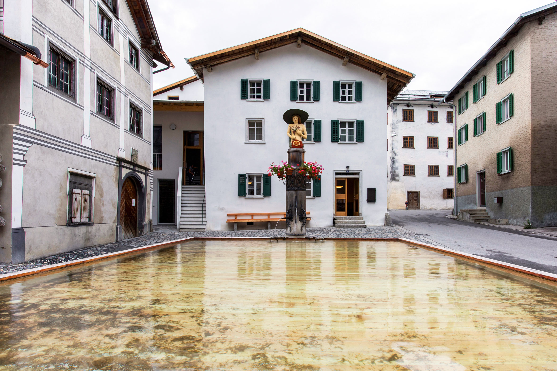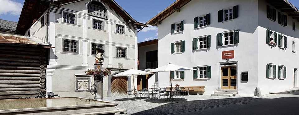 « La Engihuus (casa di Engi), situata nella piazza del paese di valendas, è stata ristrutturata e tra-sformata in Gasthaus am Brunnen. La ristrutturazione ha dato nuova vita al centro del paese e ha rafforzato il senso di appartenenza collettivo. Su iniziativa della Fondazione Valen-das Impuls l’edificio è diventato un luogo d’in-contro per abitanti ed ospiti. E dimostra come il turismo sostenibile possa funzionare in un paese montano.L’edificio restaurato, la cui parte più antica risale al 1519, ospita il ristorante per gli abitanti di valendas e sette stanze per gli ospiti al primo piano. Nell’edificio di nuova costruzione al pian-terreno si trovano la sala da pranzo e la cucina, mentre al primo piano c’è la sala comunale. Gra-zie all’intonaco di calce i due edifici costituisco-no un’unità. L’interesse principale non era quello di mettere in relazione il vecchio con il nuovo quanto piuttosto rafforzare gli elementi di iden-tificazione con il paese. »