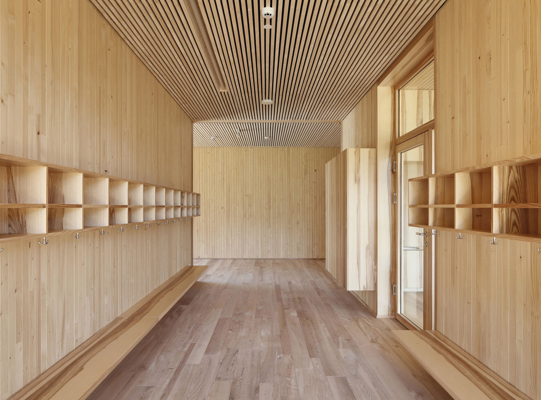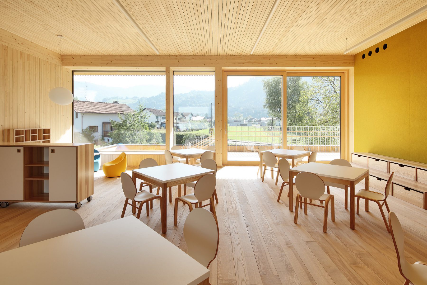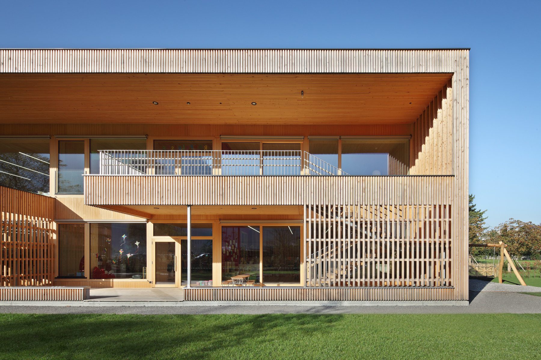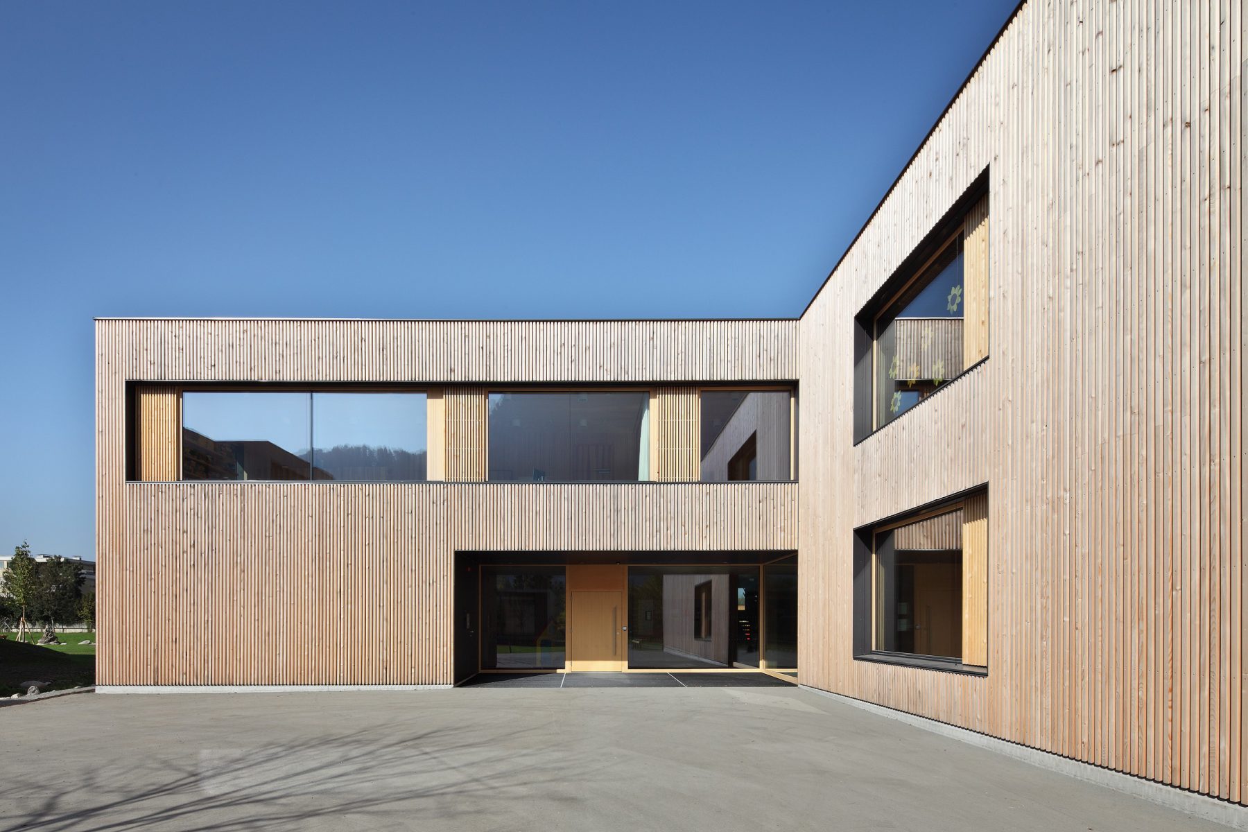 Die beiden Gebäudeteile des Kindergartens von Dornbirn in Vorarlberg sind zueinander verschoben. So schafft der Kindergarten einen Vorplatz und vermittelt zwischen dem grossen Schulhaus und der kleinteiligen Nachbarschaft. Vom Garten profitieren alle Kinder, da die Aussentreppen direkt von den Terrassen hinabführen. Das Passivhaus ist dick gedämmt mit Holzfaserplatten und aus massivem Tannen­ und Fichtenholz konstruiert, das im stadteigenen Wald in sechs Wochen nachwächst. Das Holz ist überall sichtbar: am Boden, an den Wänden, unter der Decke. So lernen die Kleinen schon früh, den natürlichen, heimischen Baustoff zu schätzen.