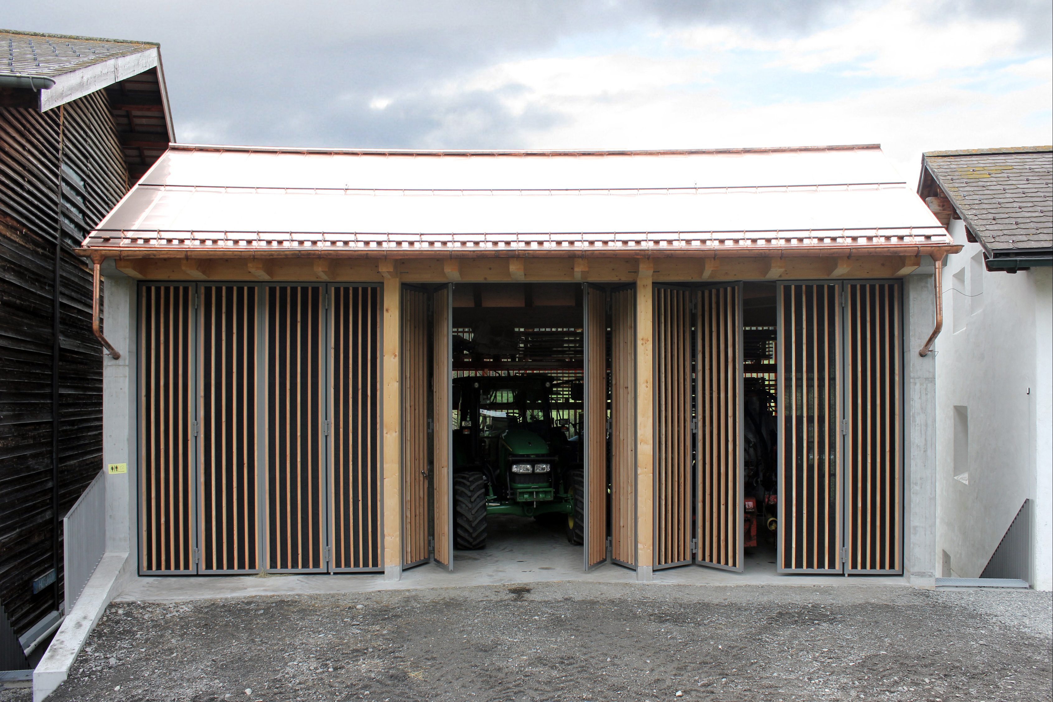 Die Remise in Madulain steht mit städtebaulichem Anspruch zwischen einem neuen Bauernhaus und dem grossen Stall. Mit elegantem Bogen verbindet die Scheune die beiden Gebäude, sodass eine geschlossene Fassade entsteht, wie sie die alten Bauten des Dorfs seit Hunderten von Jahren entlang der Hangkante bilden. Die Architektur von Christoph Sauter hat Ansprüche: Die Remise ist ein Edelrohbau, konstruktive und sichtbare Teile werden vorgeführt. Der Beton ist schön, die Holzarbeiten sind fein, die Tore verziert mit Lamellen, das Kupferdach ist gediegen. Stall, Scheune, Remise und Wohnung sind nun wie unter einem grossen Dach vereint.