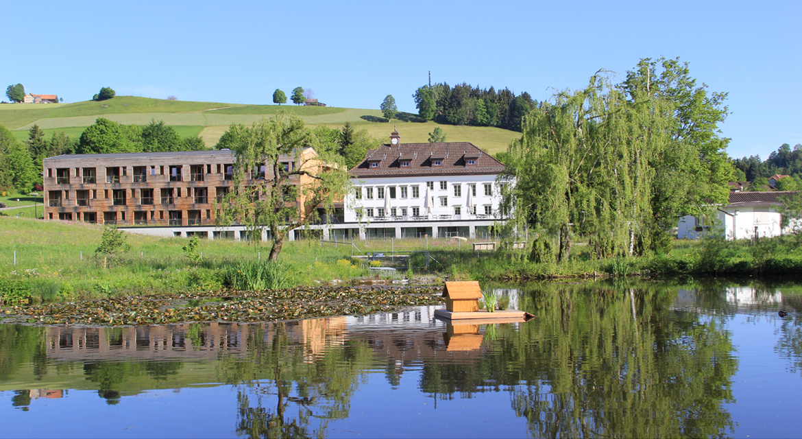Das ehemalige Kurhotel Bad Säntisblick im Kanton AppenzellAusserrhoden wurde 1792 erbaut und wird seit 1965 als Altersheim genutzt. Um mehr Platz zu schaffen, brachen die Architekten diverse An und Nebenbauten ab und erstellten einen Zimmertrakt, der über den Sockel mit dem historisch wertvollen Stammhaus verbunden ist. Im Altbau sind Büros und Sitzungszimmer untergebracht. Der Neubau ist aus leimfreiem Vollholz konstruiert, Sockel und Kern wurden betoniert. Das Holz verbindet den effzienten Grundriss mit wohnlicher Atmosphäre. Vor dem Haus öffnet sich ein grossartiger Garten, der zum Spazieren und Träumen einlädt.