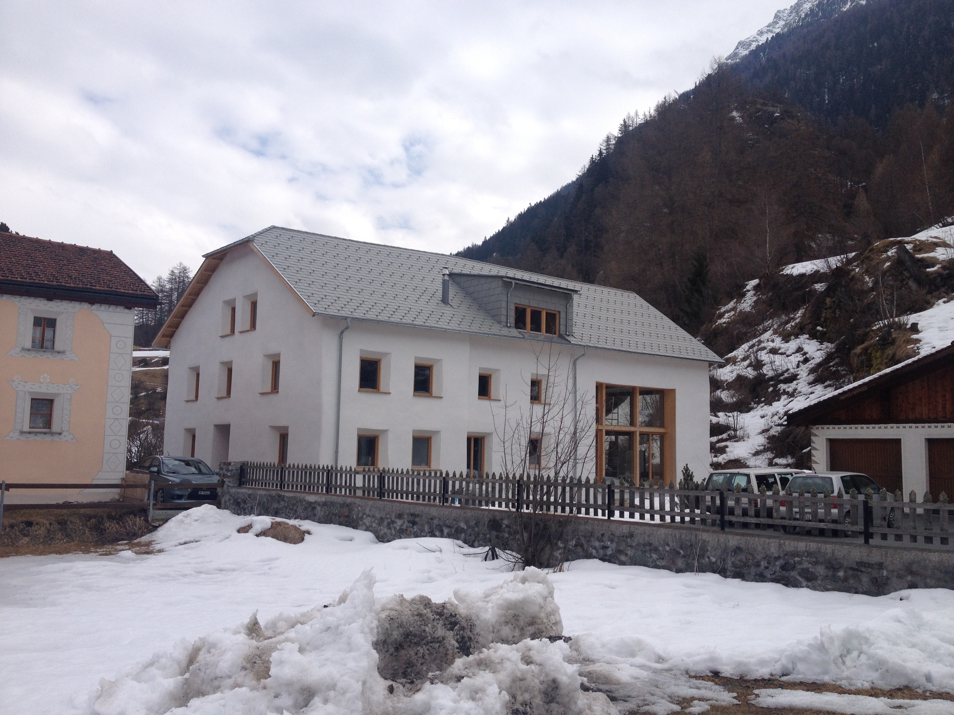 Stara kmečka hiša v vasici Susch v dolini Engadin v švicarskem kantonu Graubünden je bila pri svojih več kot 200 letih starosti deležna energijske preobrazbe. Architekt Werner Schmidt je staro peč na les nadomestil s kombinirano pečjo na lesne pelete in sekance. Objekt je bil opremljen z novimi okni s trislojnim steklom. Fasada in streha sta izolirani s plastmi sena, z debelino do 80 cm. Skupaj je bilo za izolacijo porabljenega približno 80 ton sena, kar sovpada s približno 110 tonami CO2, skladiščenega v objektu. Seneni ovoj zagotavlja tudi blagodejno notranjo klimo in predstavlja učinkovito zaščito pred hrupom iz okolice. Izolacija vodi do masivnega zidu z globokimi okenskimi odprtinami, tipičnimi za engadinske kmečke hiše. Projekt povezuje gradbeno tradicijo, gradbeno ekologijo in energijsko varčnost.