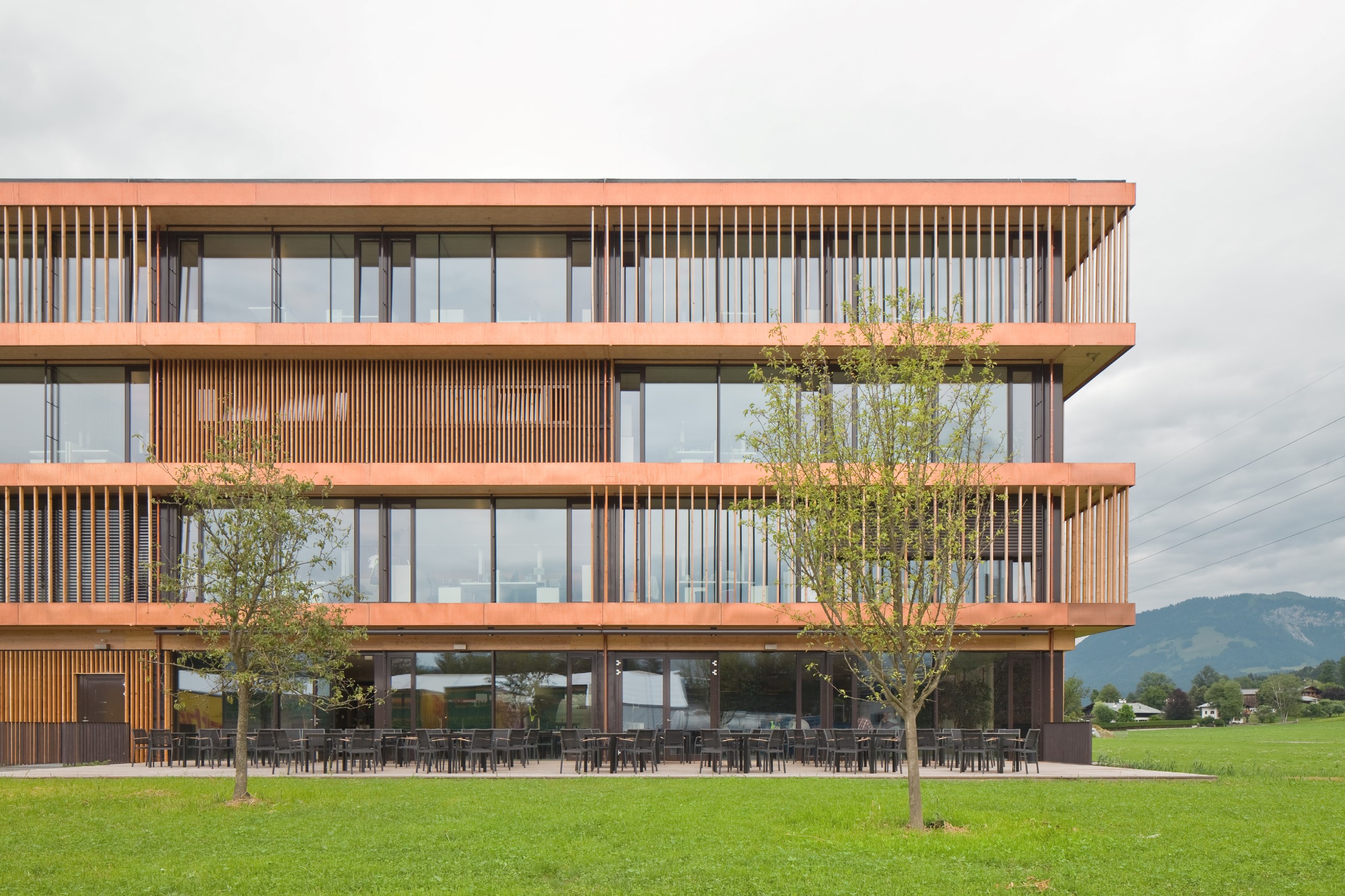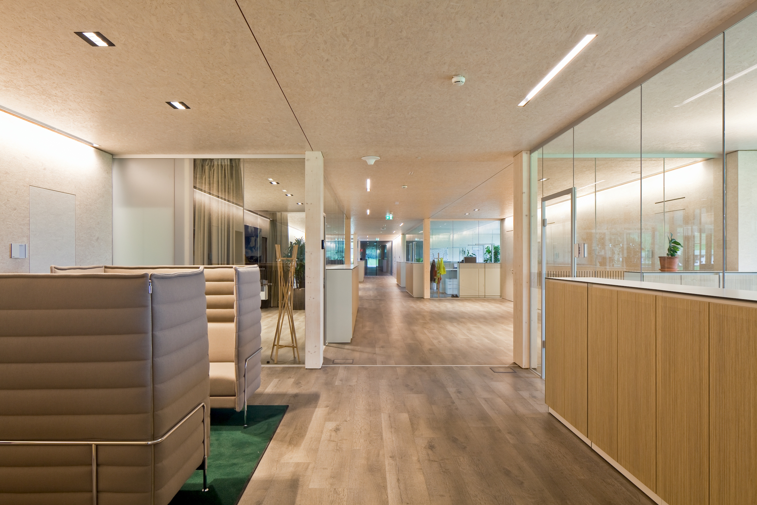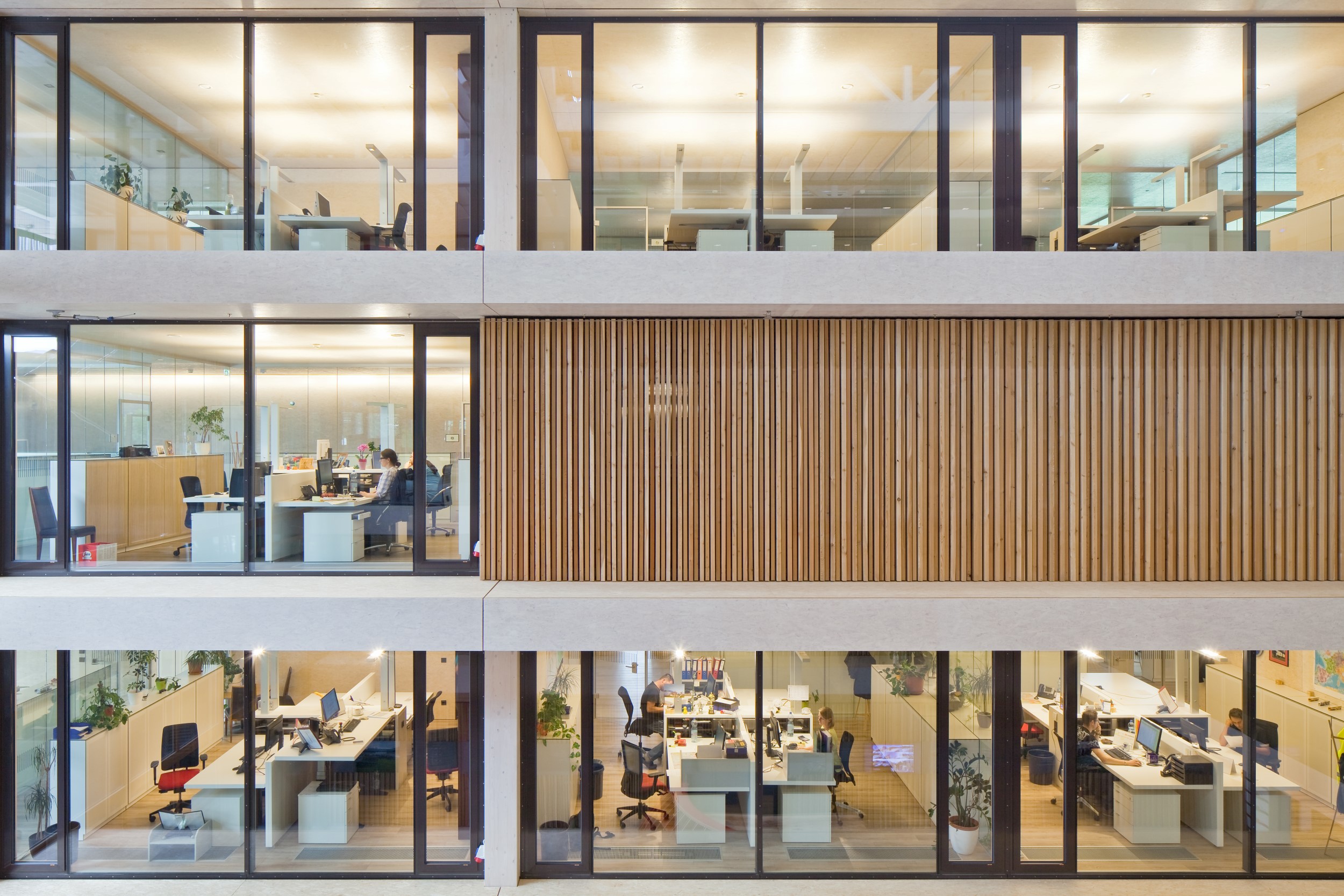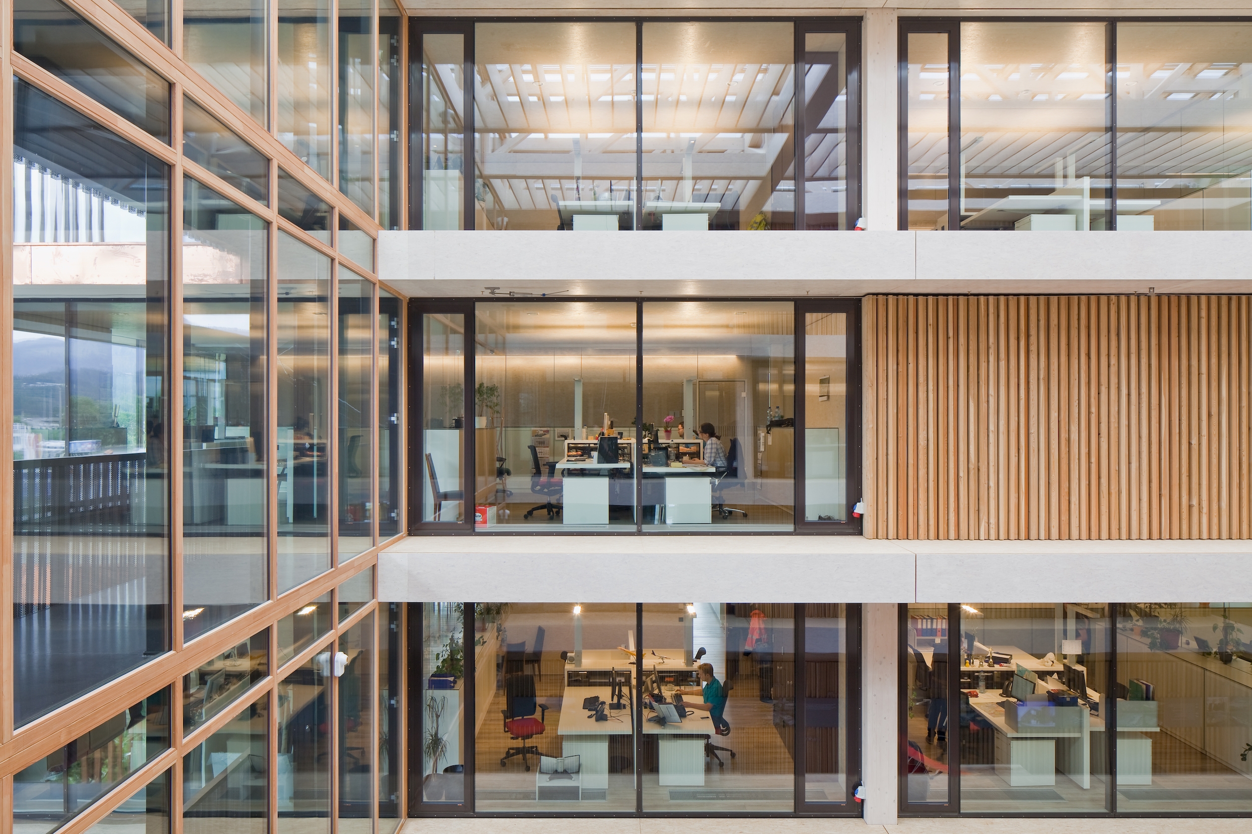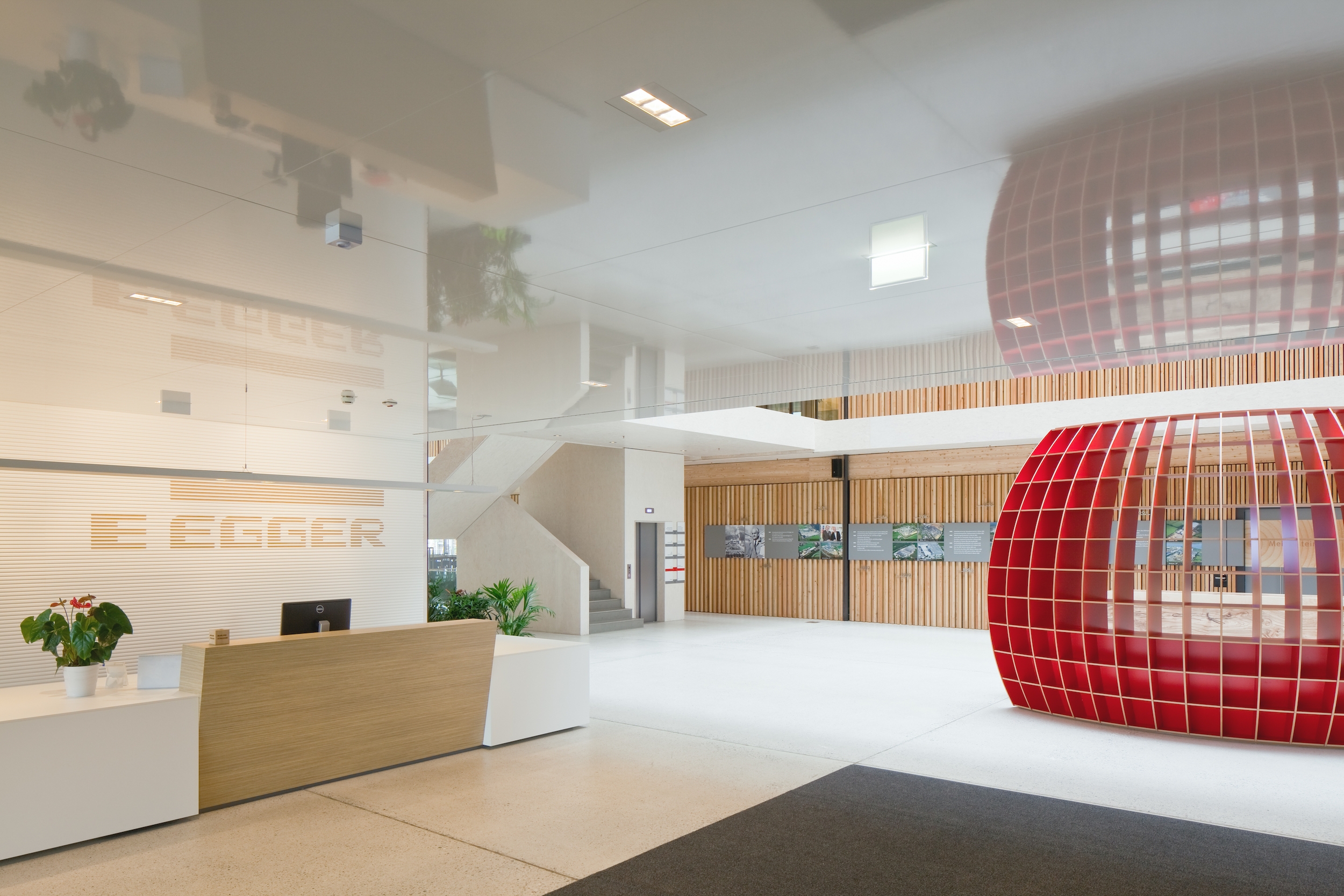 Industrijsko merilo Poslovni objekt je ločen od delavnic in deluje kot slikovita izložba lesarskega podjetja Fritz Egger v St. Johannu v avstrijski deželi Tirolski. Objekt je že četrta upravna stavba, ki jo je podjetje projektiralo in izvedlo v skladu z lastnimi, visokimi standardi. Prostori so porazdeljeni okrog odprtega atrija, ki ne pogojuje prostorske hierarhije. Vsi zaposleni in vodje oddelkov sedijo v istih oddelčnih pisarnah. Struktura je modularna in temelji na ploščah OSB ( 2,8 m x 11,5 m ). Celotna inštalacija je vgrajena v belih, lakiranih ploščah OSB. Fasada je obložena z vertikalnimi deskami iz lesa macesna. Objekt je ogrevan prek sistema za daljinsko ogrevanje, ustrezno hlajenje pa je zagotovljeno s pomočjo vodnjaka. Podzemna garaža je opremljena s polnilnimi postajami za električna vozila. Podjetje Fritz Egger je s projektom dokazalo, da je les je več kot primeren za gradnjo velikih, okolju prijaznih poslovnih stavb. Iz lastne lesne proizvodnje denimo izhaja tudi vsa notranja oprema. Kvantiteta in kvaliteta lahko vendarle hodita z roko v roki. Andres Herzog / Hochparterre