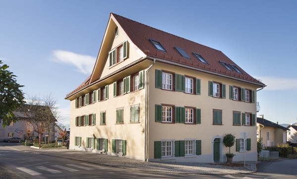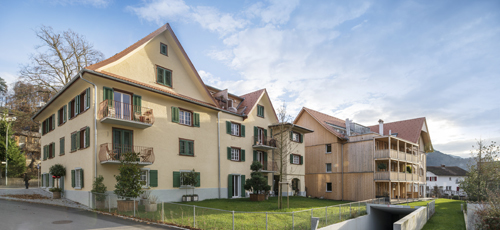 Die beiden Häuser in Dornbirn Oberdorf stammen aus dem 18. und 19. Jahrhundert. Vom ersten konnten die Architekten die Grundmauern und den Strickbau retten, den Wirtschaftstrakt mussten sie abbrechen. Der neue HolzStänderbau ist mit Schindeln, der Ökonomieteil mit ungehobelten Brettern verkleidet. Das zweite Haus konnten die Architekten erhalten. Es wurde statisch verstärkt und saniert. Nach dem Umbau verfügt das Ensemble über 22 Wohnungen, sieben sind für autofreie Bewohner. Geheizt wird mit einer Erdsonde mit Wärmepumpe. Mit einer Ausnahme stammen die Handwerker aus der Region.